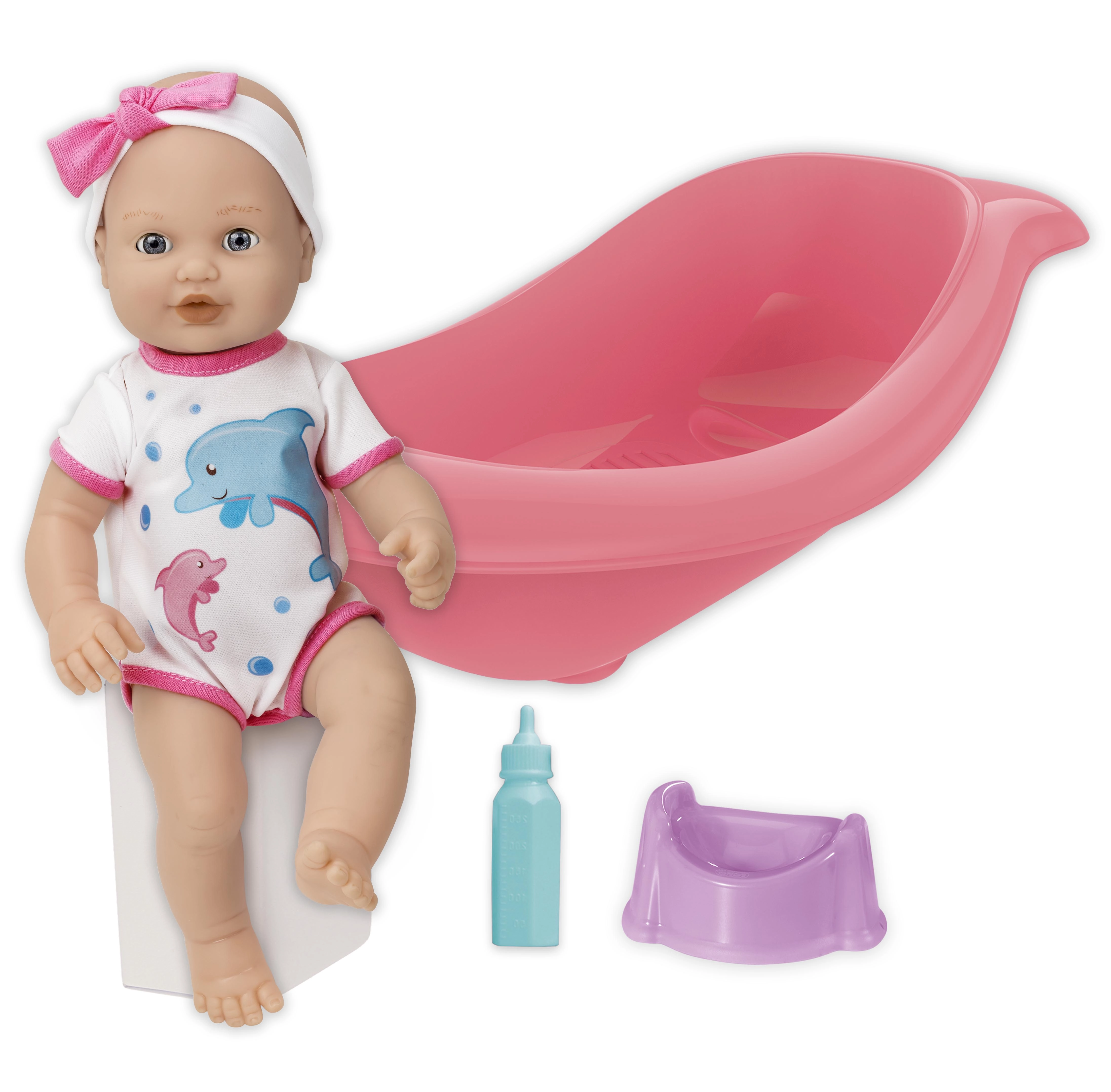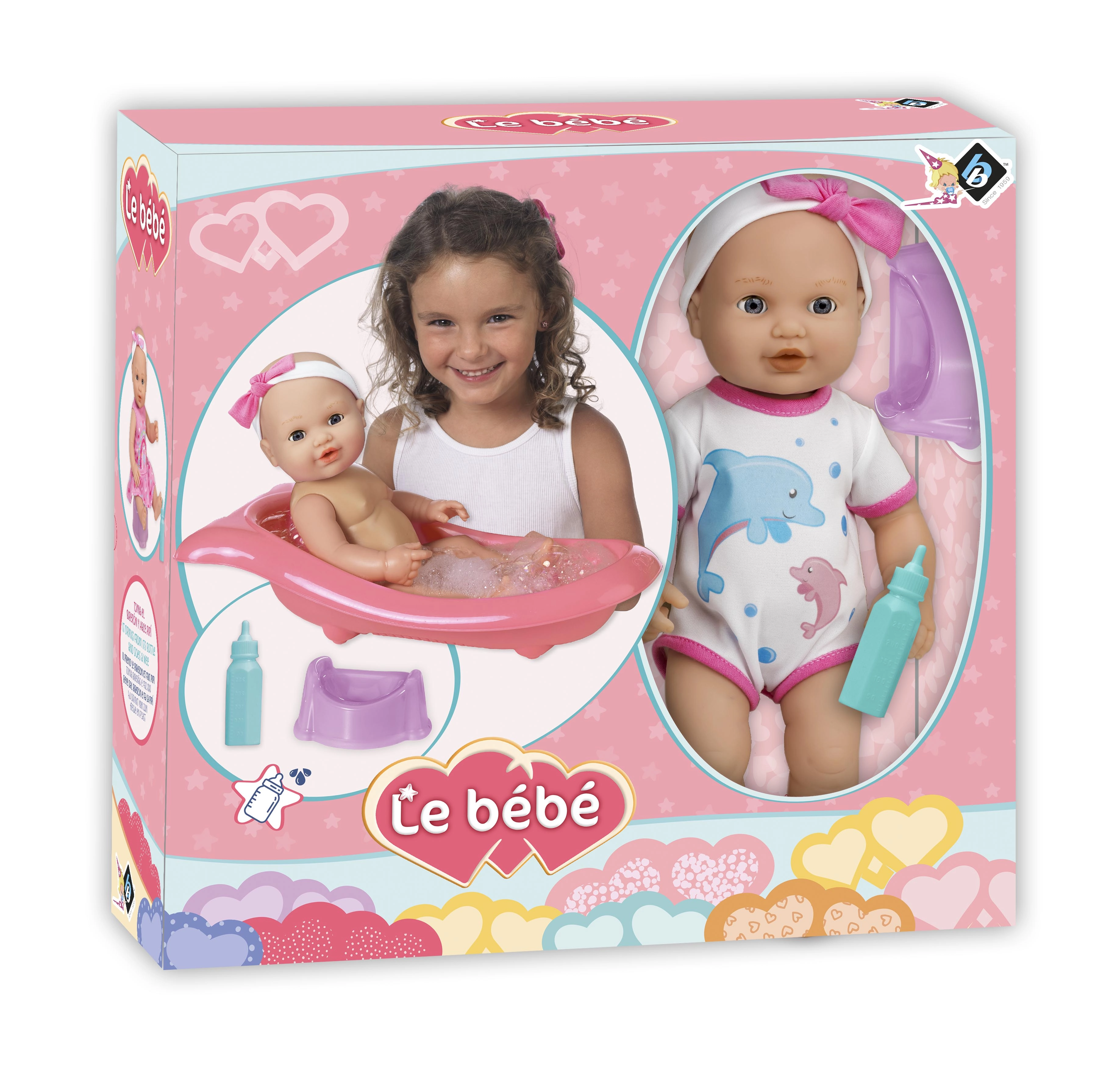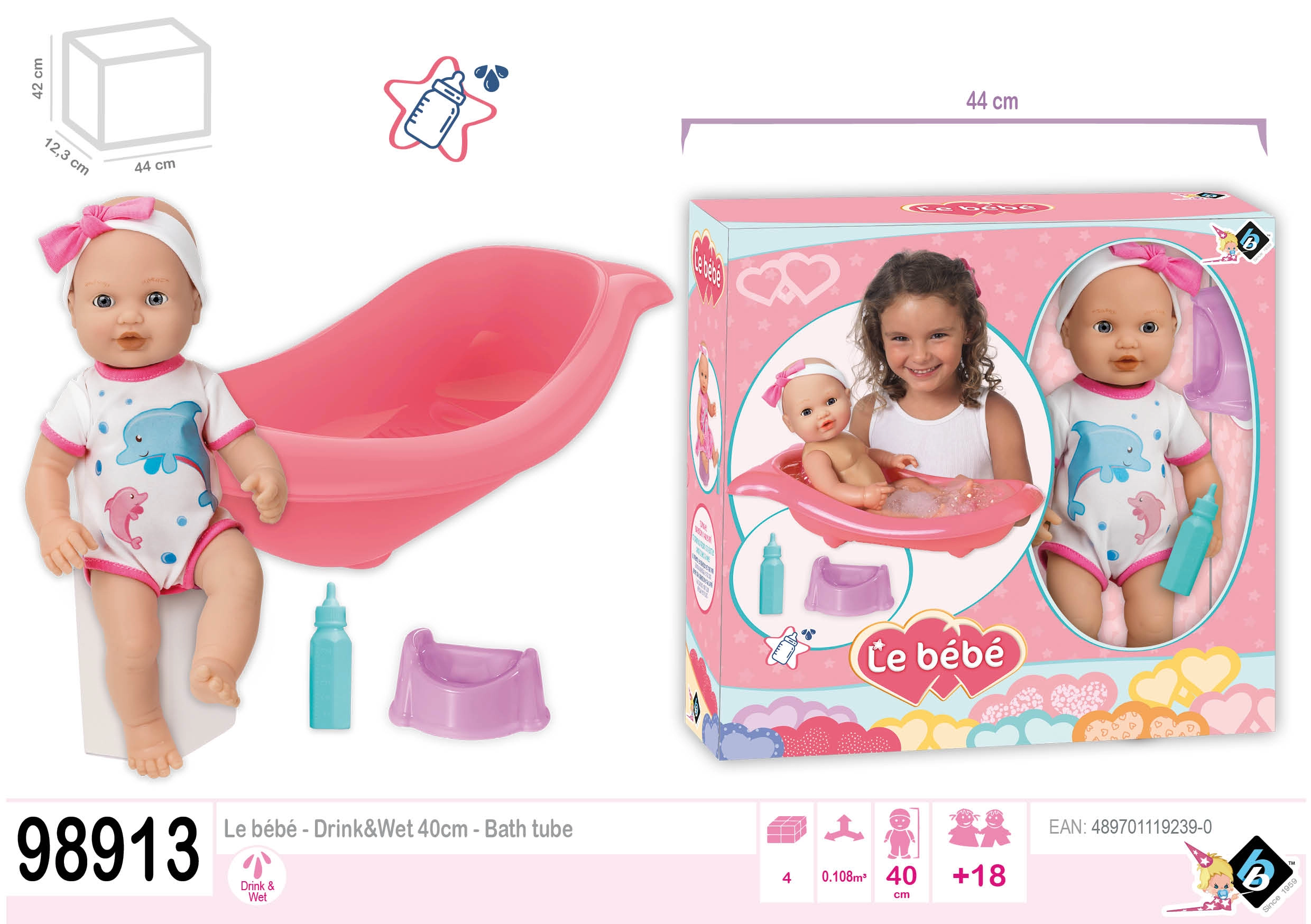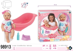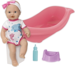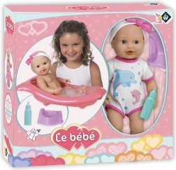 Очарователна кукла със сет за къпане и повиване ще зарадва всяко дете. В комплектa са включени ваничка с дължина 41 cm, шишенце и гърне. Куклата има подвижна глава и крайници и при поставяне по гръб затваря очи. Благодарение на функцията „пишкане“ след пиене от шишенцето децата се радват на реалистична игра на грижи.