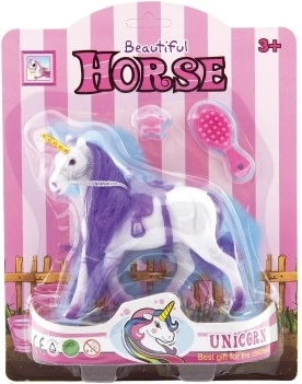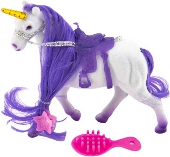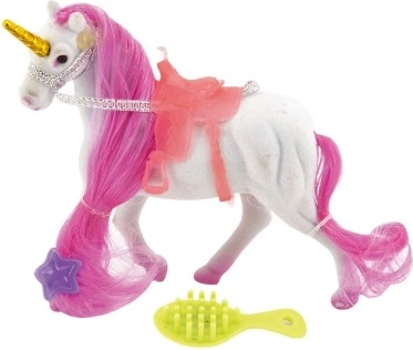 Очарователен пластмасов еднорог с копринено мека повърхност носи на децата магията на фантазията. Има богата грива и опашка за ресане, не липсват седло и аксесоари за още по-забавна игра. Идеален подарък за любители на коне от 3 години.