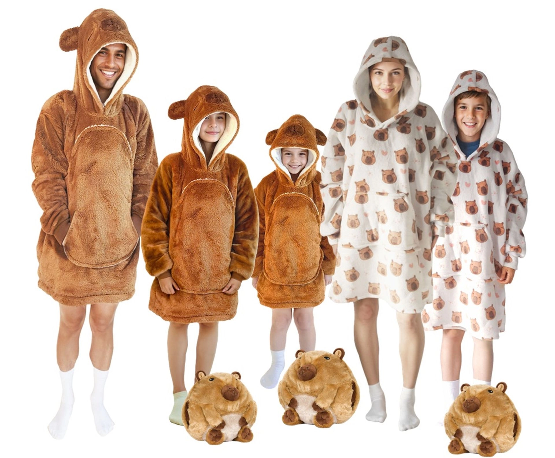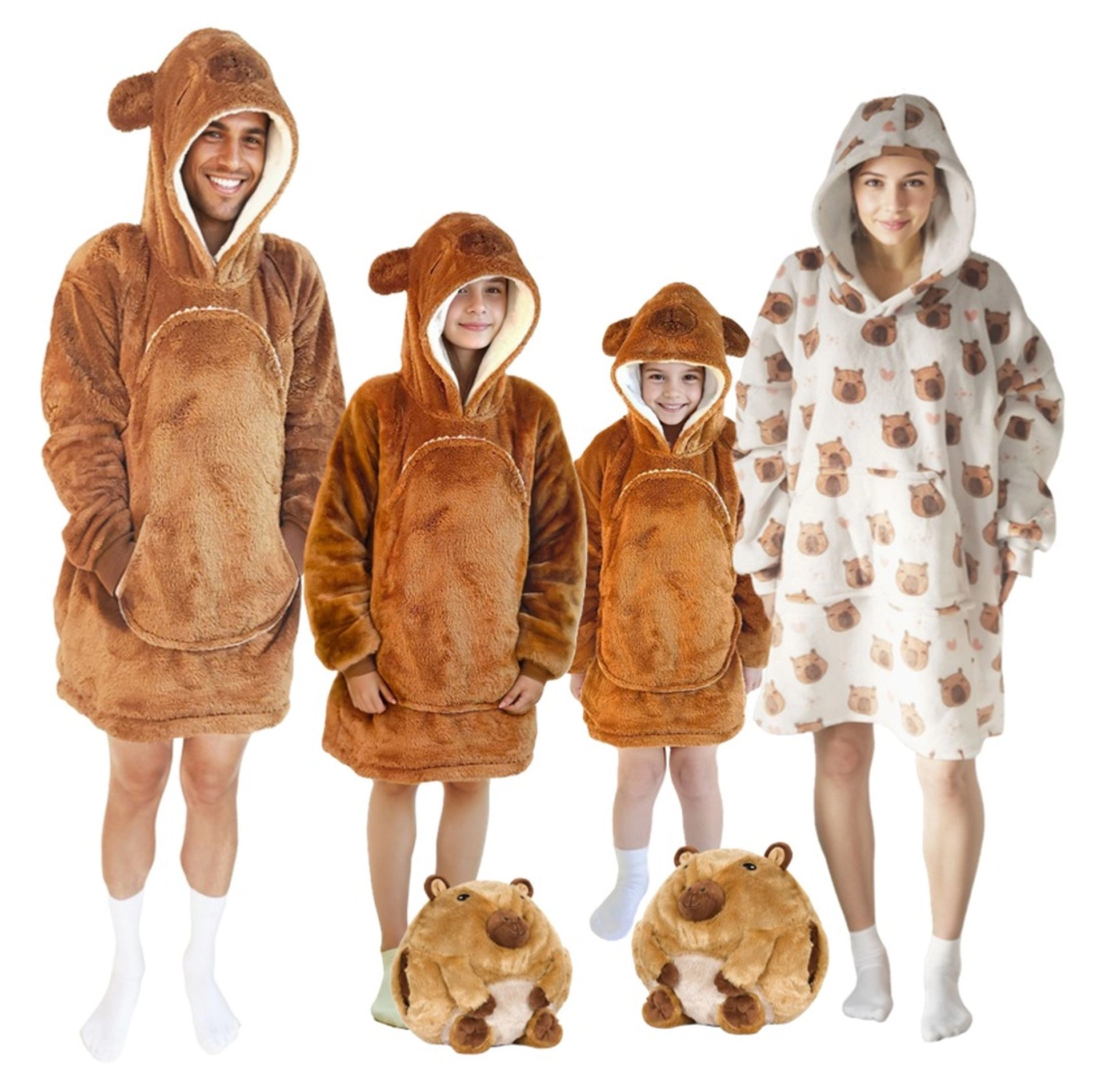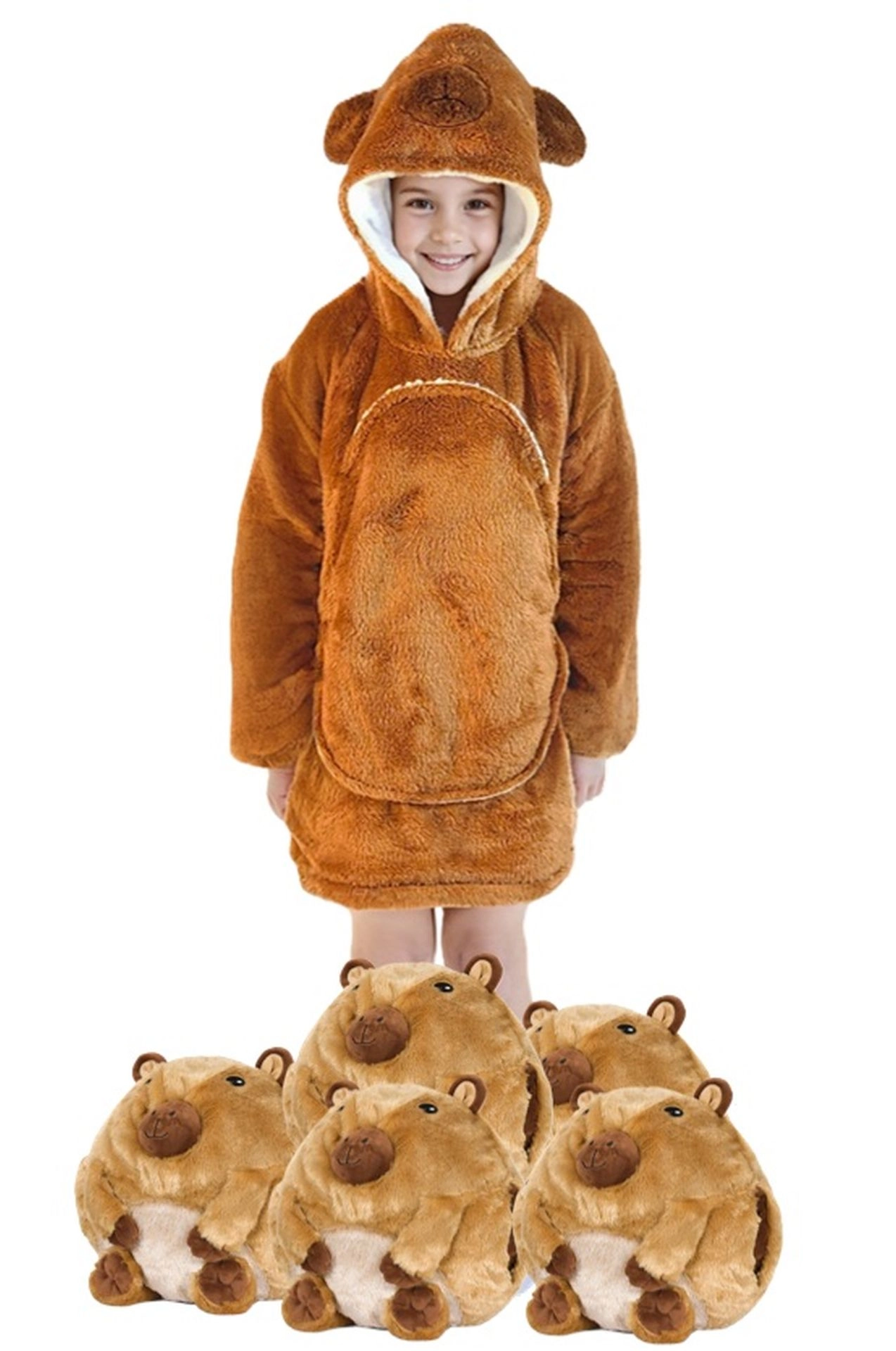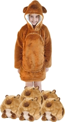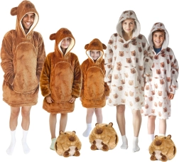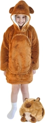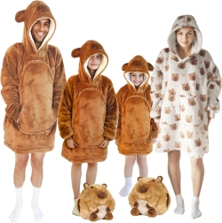 Това детско одеяло-суичър с качулка в дизайн на капибара е като прегръдка, която стопля от глава до пети. Вътрешният слой от шерпа флийс е пухкав и топъл, а външната страна от мек фланел е копринено нежна на допир. Благодарение на оверсайз кройката децата се чувстват удобно при гледане на телевизия, игра и почивка.