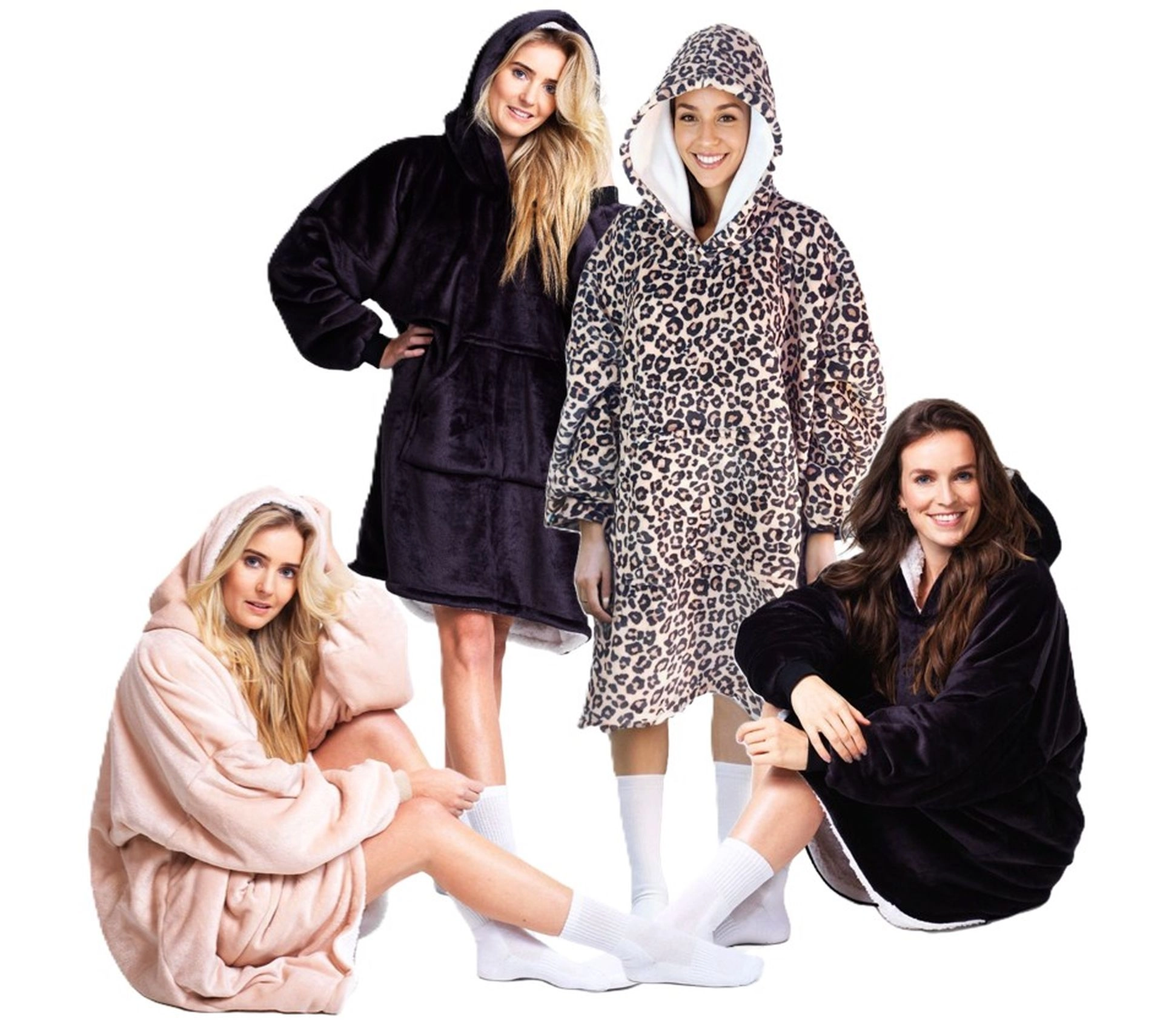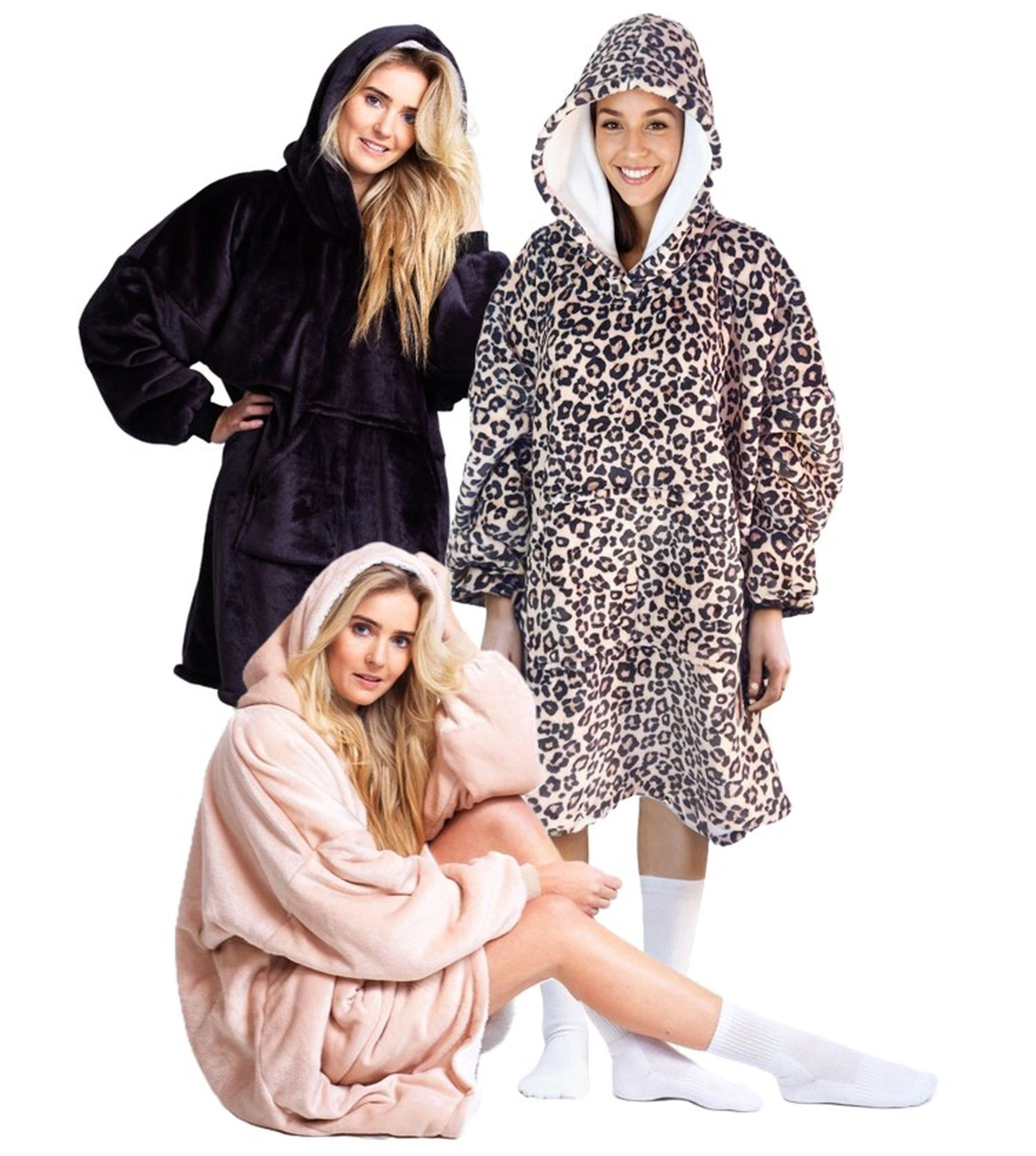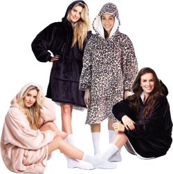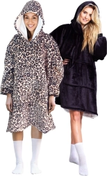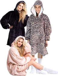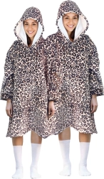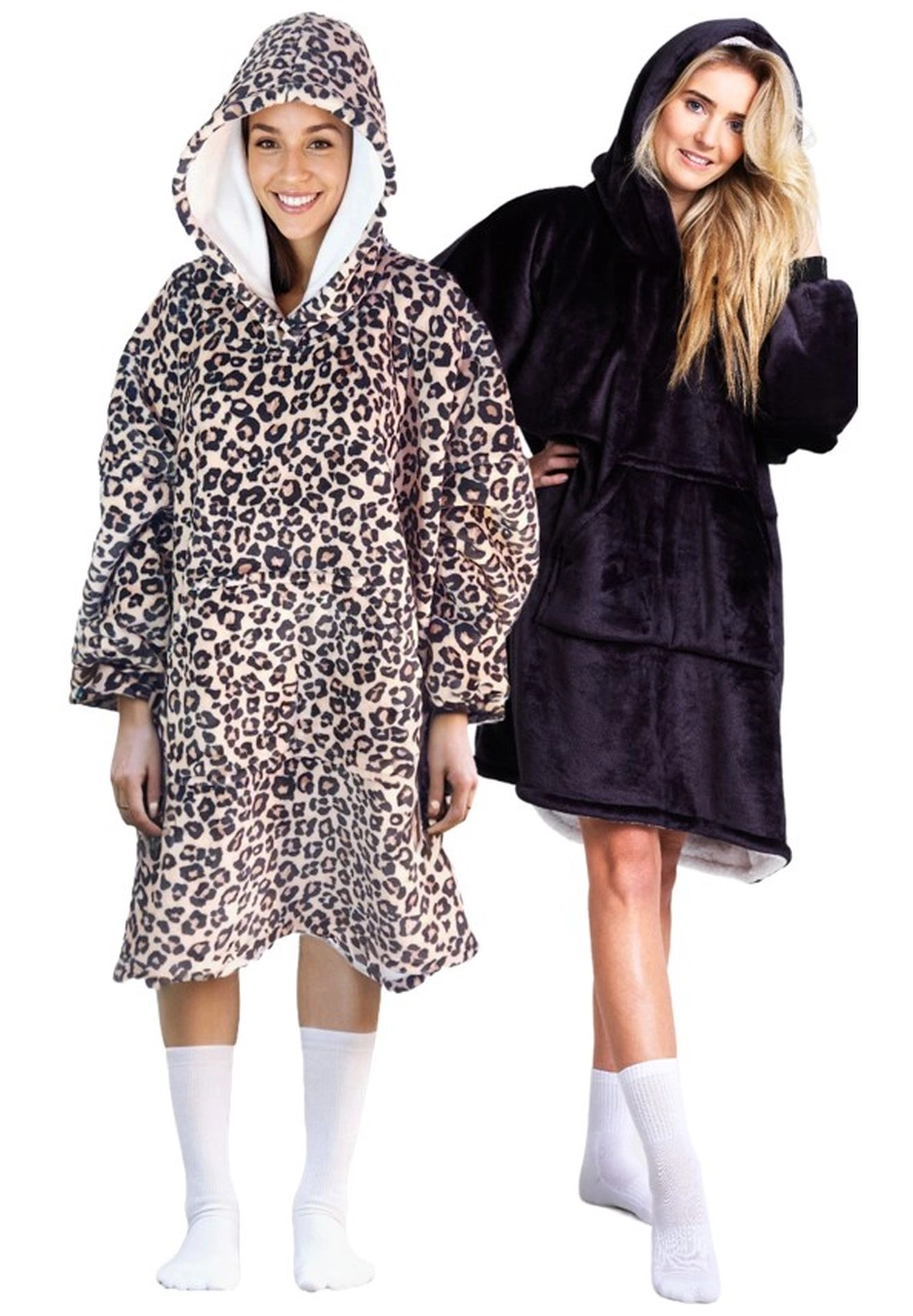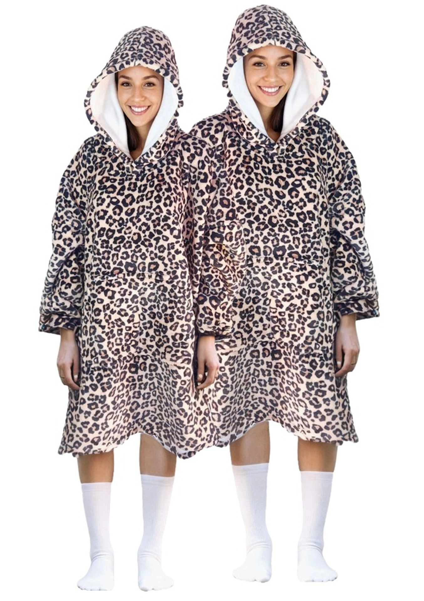 Завийте се в максимален уют – този оверсайз суичър-одеяло с качулка съчетава мека външна страна от фланел и затоплящ шерпа флийс отвътре. Благодарение на огромния преден джоб, свободната кройка и дължината до коленете е идеално за излежаване у дома, работа на компютър и седене на открито. Стилният леопардов десен придава шик на вашата почивка.