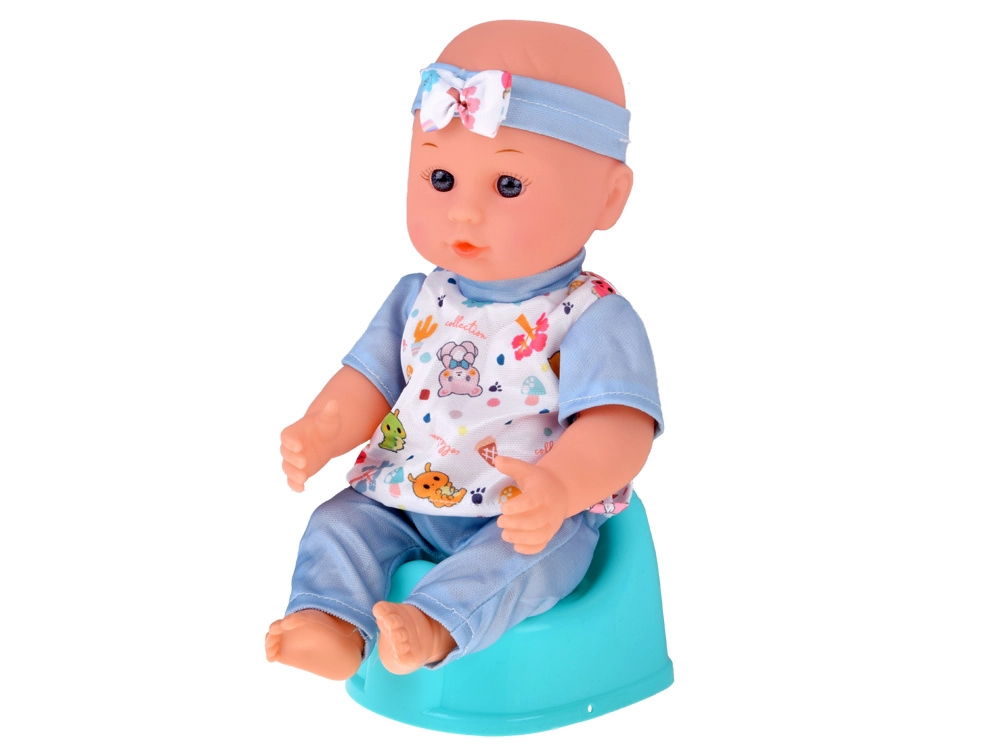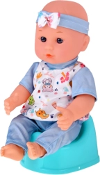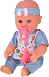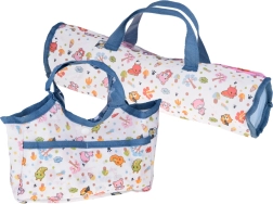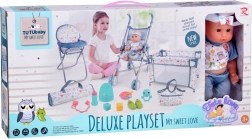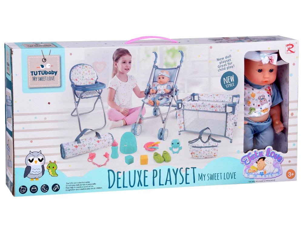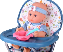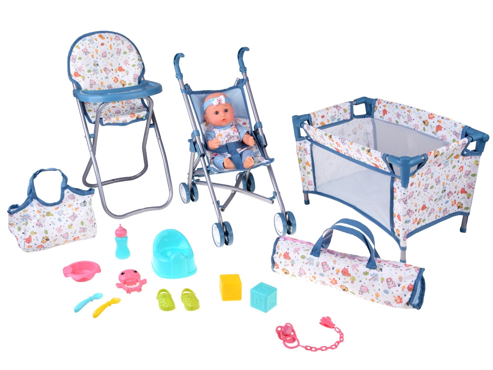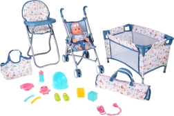 Пълен игрови комплект за малки грижещи се: сладка бебе-кукла с богато оборудване за хранене, повиване, спане и разходки. Включва сгъваема количка, столче за хранене, пътна кошара с чанта, гърне, бутилка, купичка с лъжичка и виличка, биберон на верижка, играчки и обувчици. Този комплект развива емпатия, креативност и ролеви игри и осигурява часове забавление у дома и в движение.
