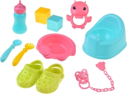 Практичното оборудване включва сервиз за хранене (купичка, прибори и шишенце), гърне, биберон с верижка, цветни кубчета и дрънкалка. Пътната кошара с дишащи мрежести страни и чанта е идеална за игра и съхранение. Благодарение на богатите аксесоари децата лесно имитират истинска грижа за бебе и развиват комуникация и фина моторика.