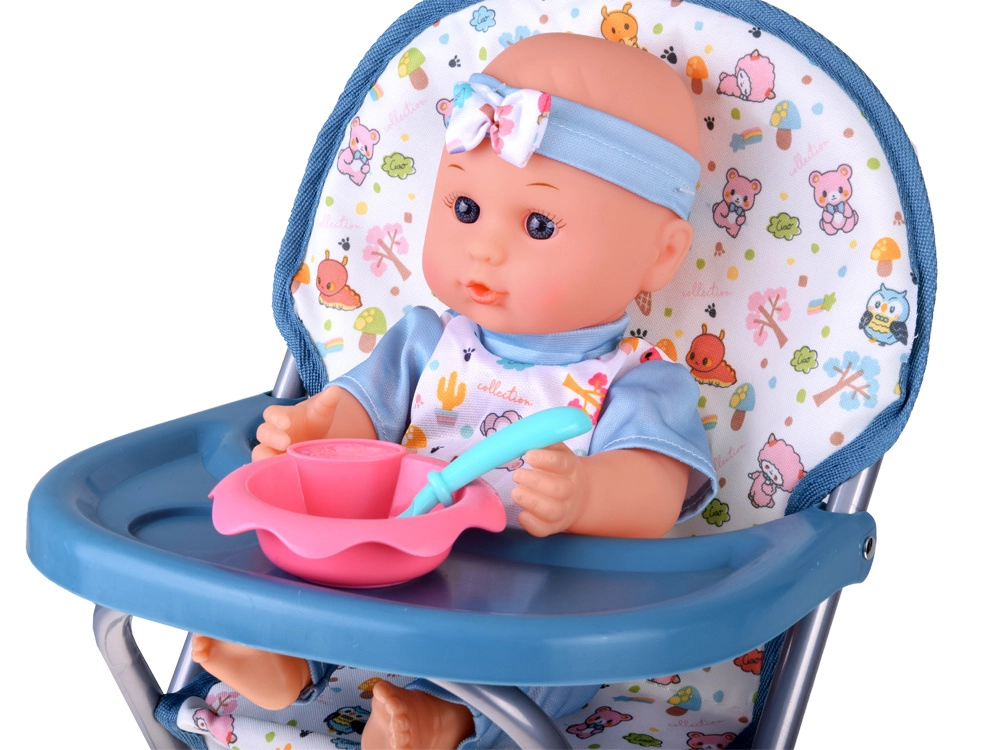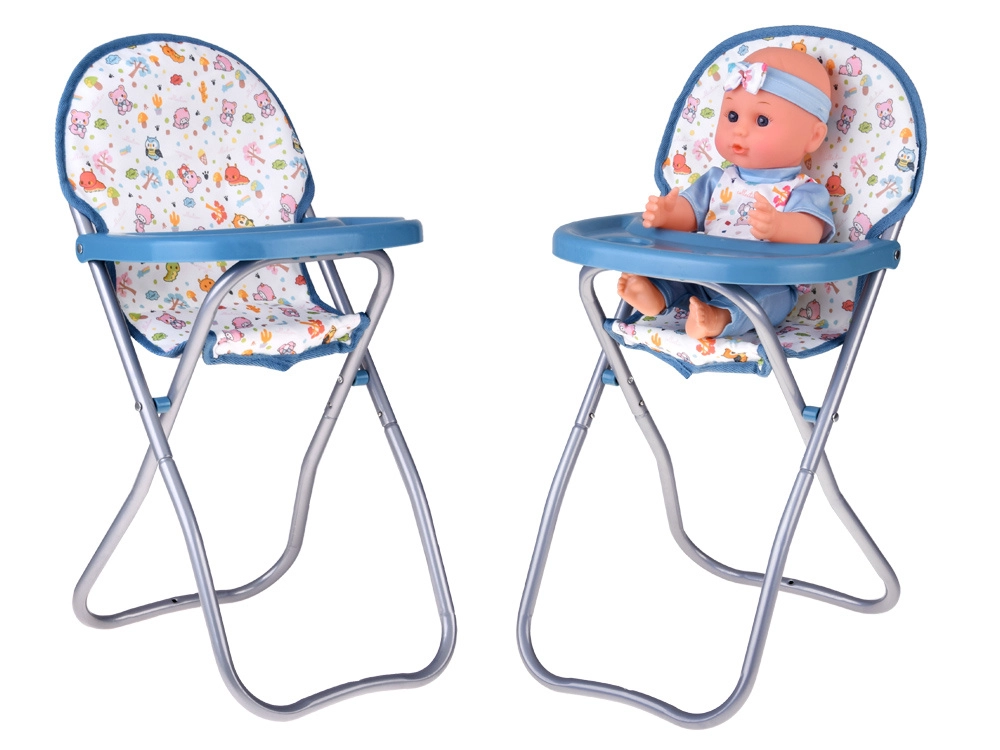 Стабилно сгъваемо столче с поднос и място за купичка и прибори. Подкрепя реалистична игра на хранене и хранене на маса с куклата.