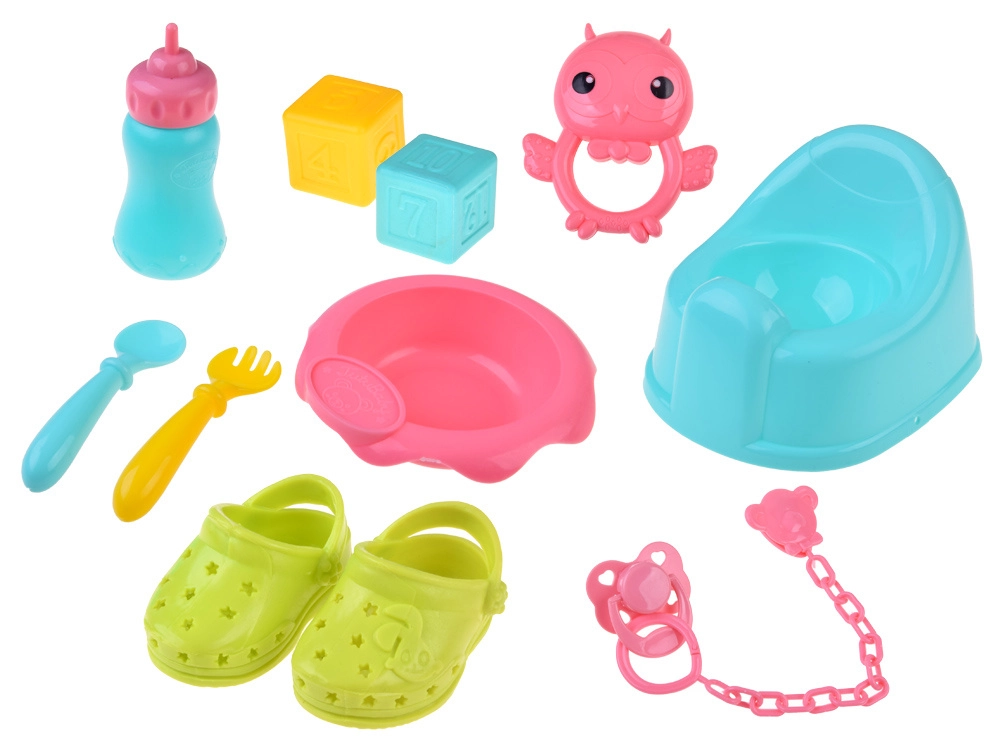 - Купичка, лъжичка, виличка, шишенце, гърне, биберон с верижка, дрънкалка, кубчета, чанта