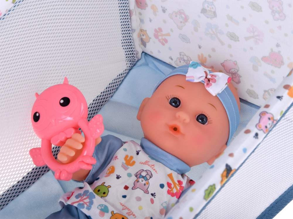 Зарадвайте децата с реалистичен комплект за грижа за бебе, който включва всичко необходимо за ежедневните ритуали – от хранене и разходка до приспиване. Куклата има подвижни крайници, меко облекло и седи в столчето и количката. Количката и кошарата са с лека и сгъваема рамка, така че се пренасят лесно и се прибират бързо.