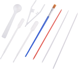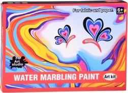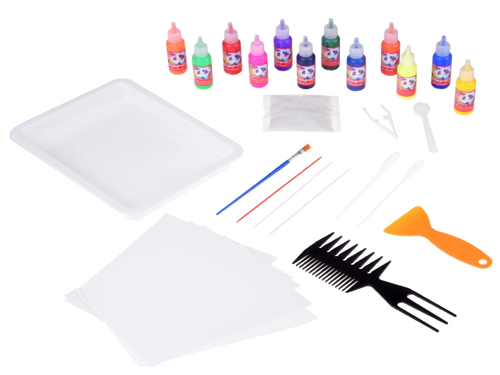В опаковката ще намерите всичко необходимо: 12 шишенца боя (16 ml) с прецизен накрайник, пластмасова ваничка, хартии и комплект инструменти (капкомери, гребен, четка, шпатула и др.). След смесване на праха с вода създавате гелообразна вана, в която капвате боите и моделирате шарката – след това просто я отпечатвате върху хартия.