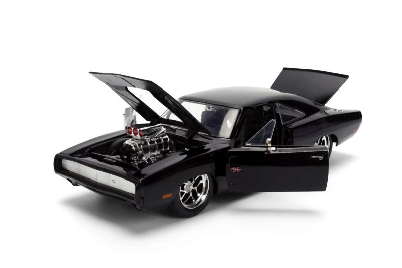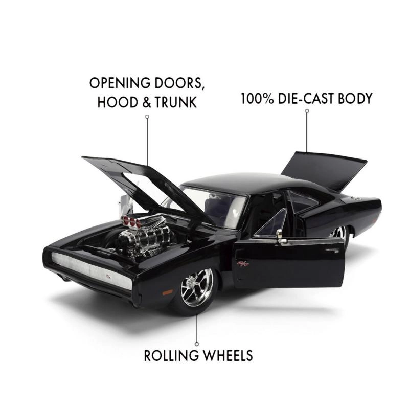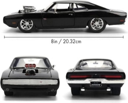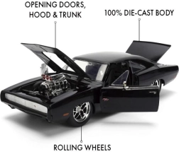 Иконичният колекционерски модел 1970 DODGE CHARGER от филма Бързи и яростни в мащаб 1:24 ще зарадва феновете на muscle автомобилите и филмовата поредица. Предлага метално изработване, отваряеми врати, капак и багажник и реалистични детайли, включително изразителен компресор на капака. Дължината на модела е приблизително 21 см.