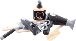 Забавен фризьорски комплект за малки стилисти носи всичко необходимо за креативна игра. Включва платнен колан, аксесоари и функционален сешоар на батерии, който при включване свети и издава звуци. Идеален за развитие на фантазията и ролеви игри за деца от 3 години.