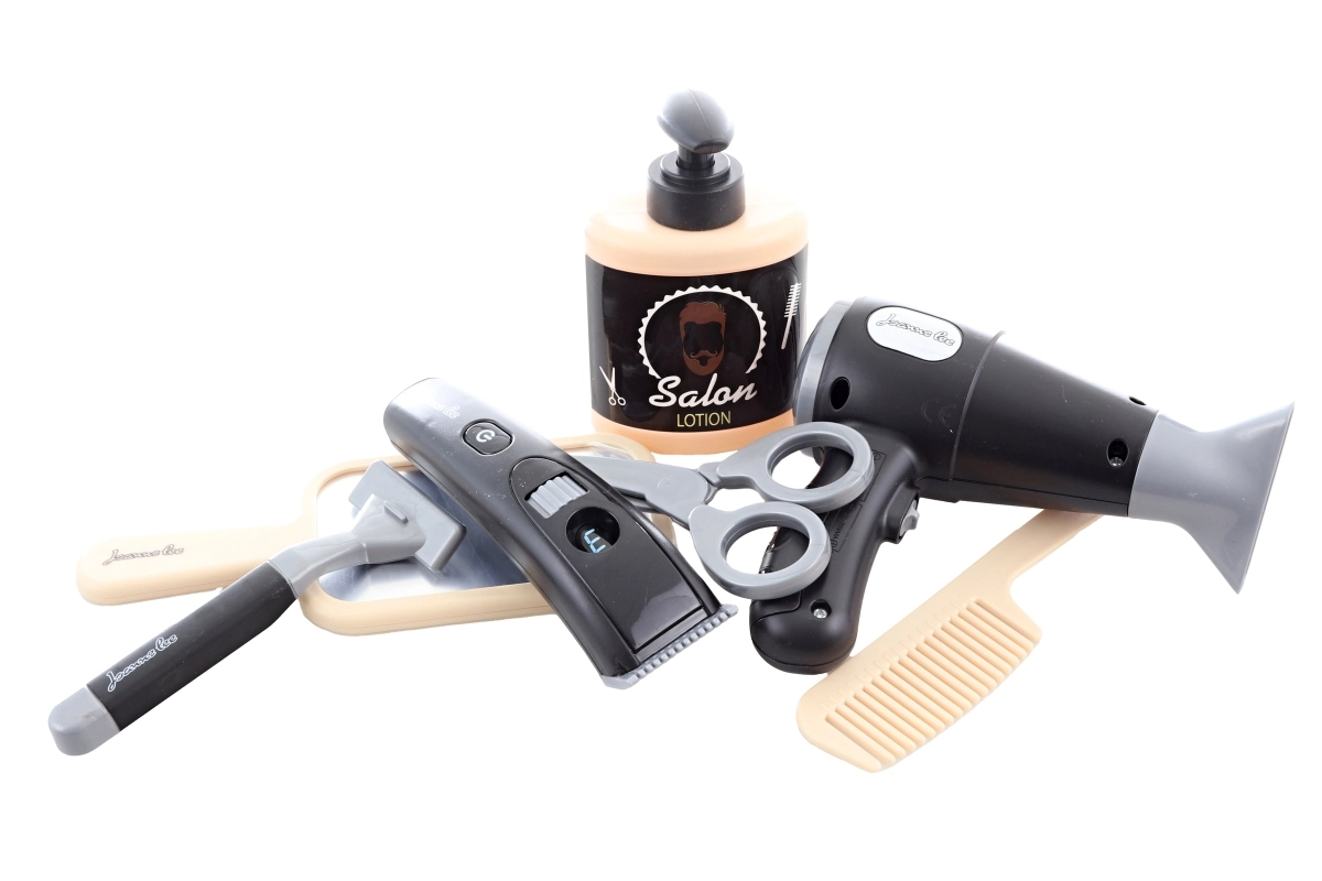 Подарете на децата реалистично изживяване от фризьорски салон. Този фризьорски комплект съдържа практичен платнен колан за подредено съхранение на инструментите, богати аксесоари и сешоар на батерии, който при включване свети и издава звук, като засилва усещането за истинска работа в салона.