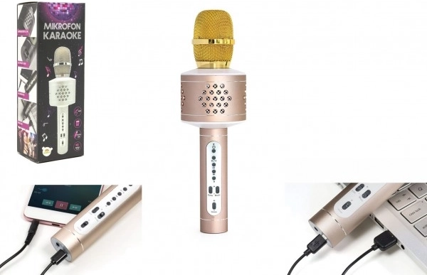 - караоке микрофон, USB–Micro USB кабел за зареждане, аудио кабел, инструкция