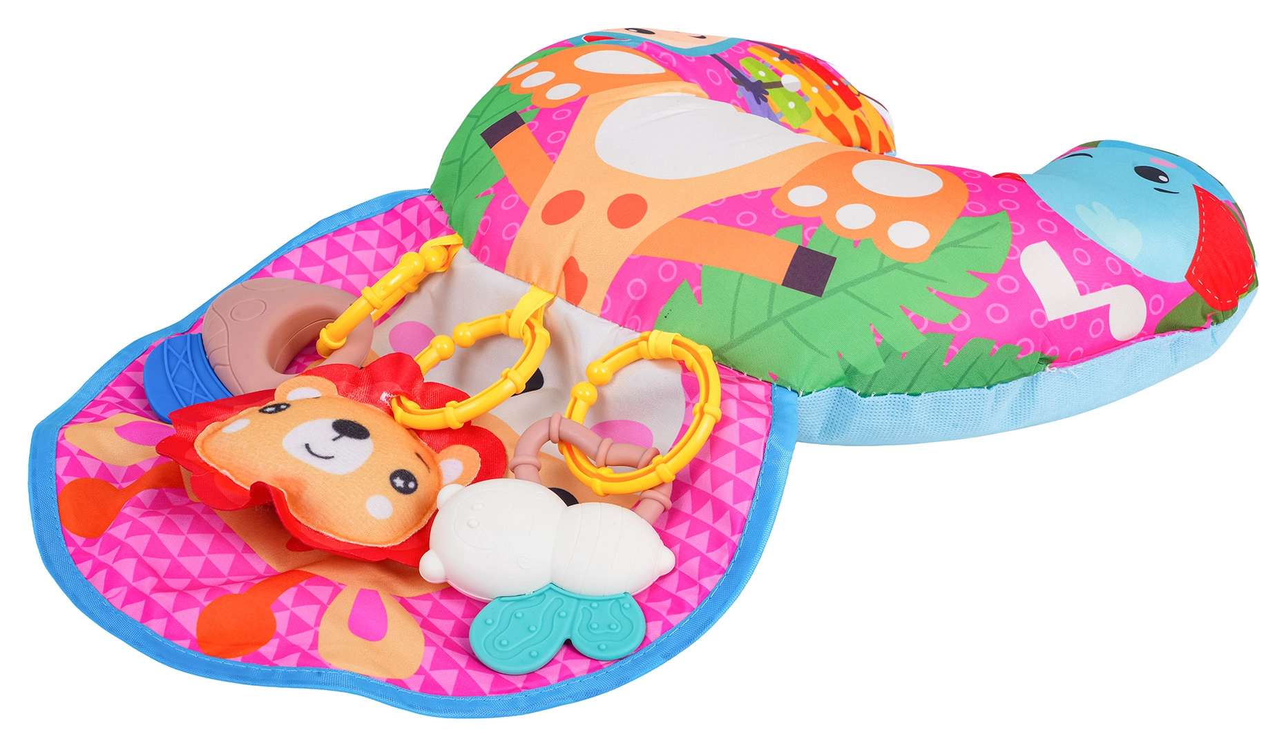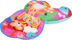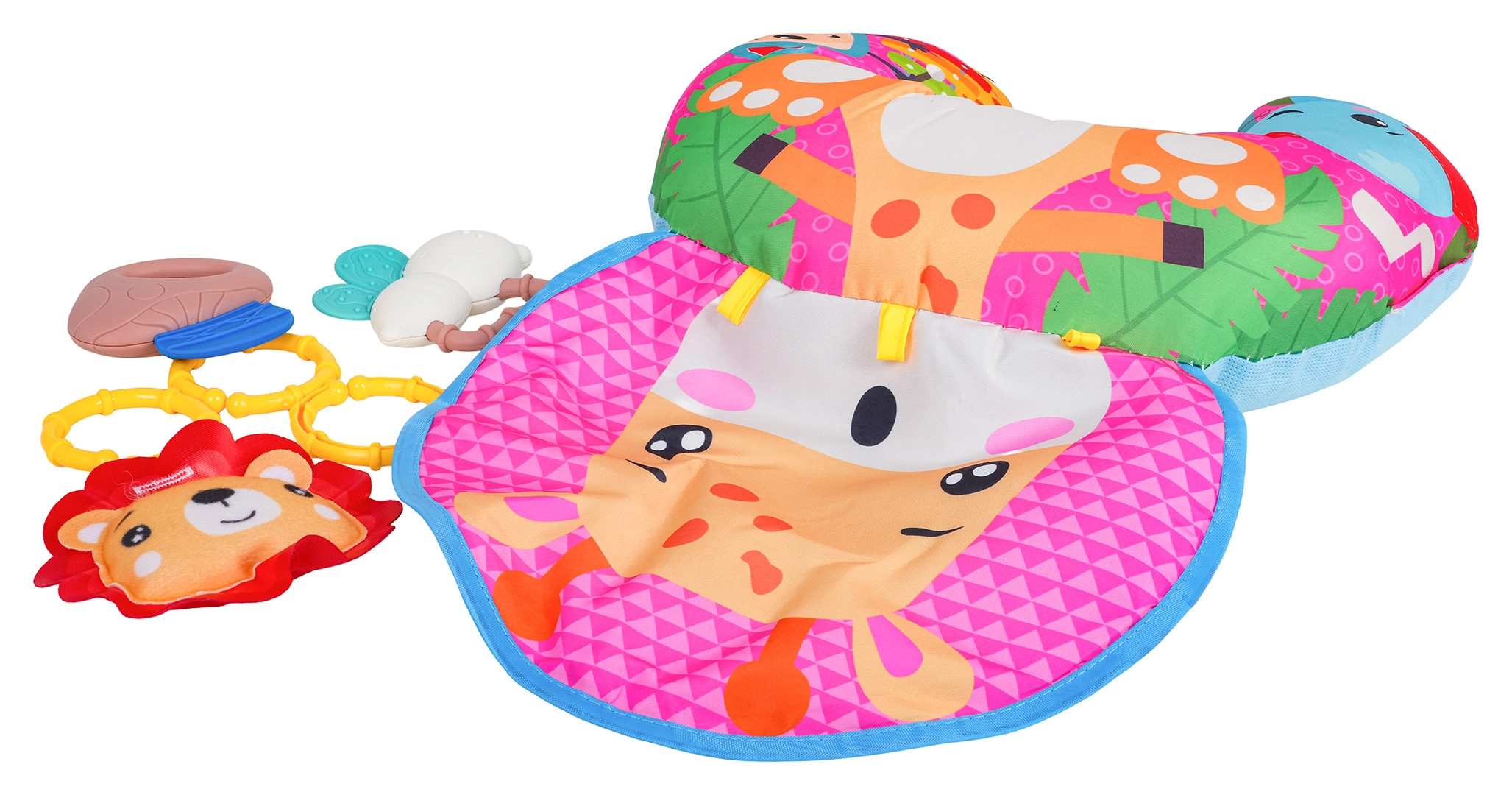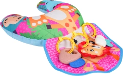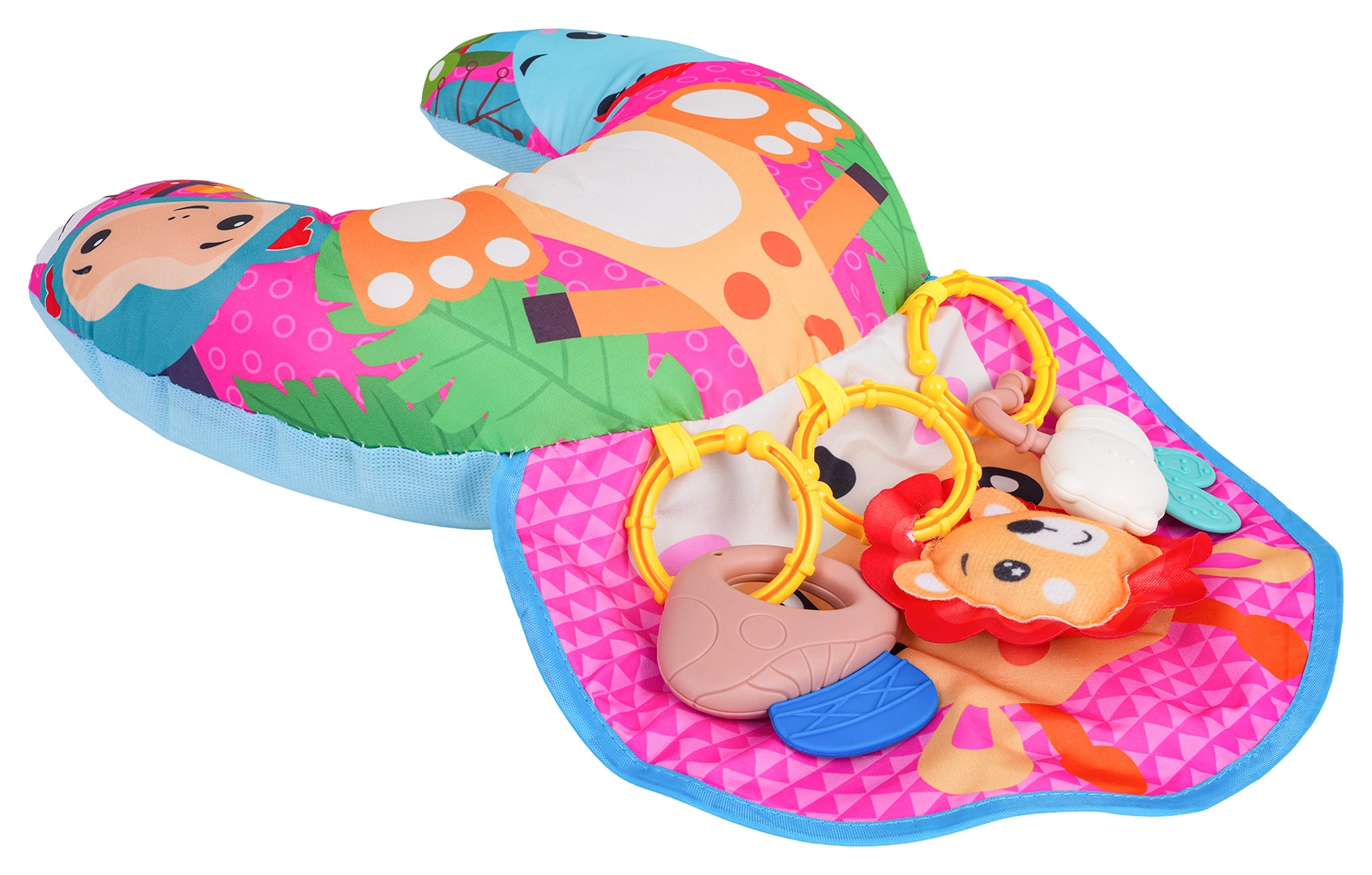 Мека и цветна бебешка U‑образна възглавница с мотив на жираф подпомага бебето при игра по корем и при седене. Включва свалящи се висящи играчки с гризалки, дрънкалка и свирка, които развиват сетивата и моториката. Подходяща от първите дни от живота, изработена от безопасни материали.