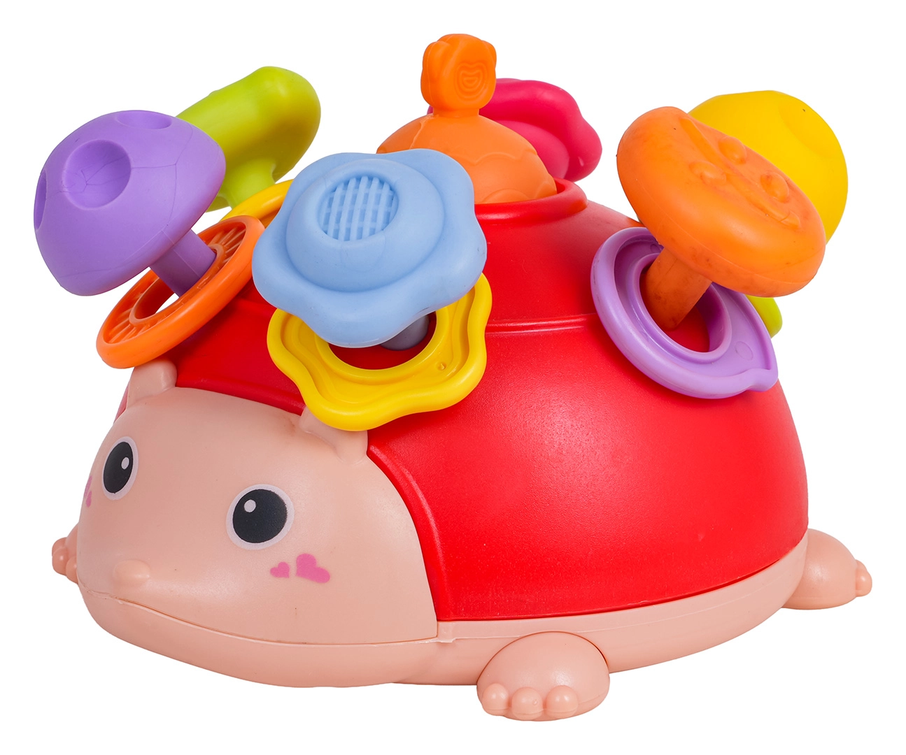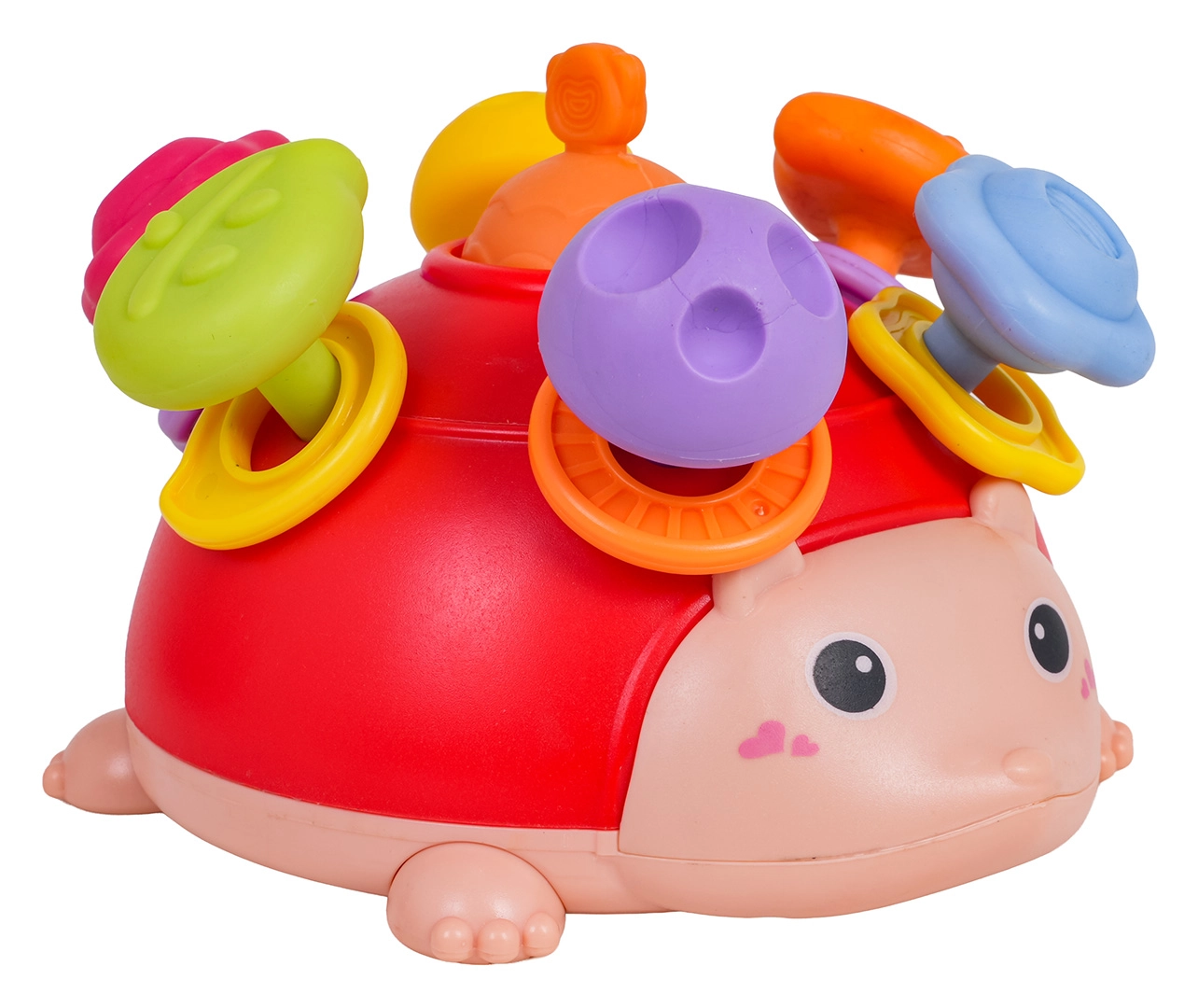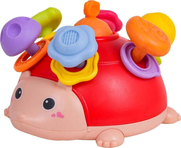 Този мултифункционален таралеж комбинира сетивна, манипулативна и моторна игра в едно. Детето може да натиска, дърпа, върти и разклаща – всяко действие възнаграждава малкия изследовател с различен стимул. Меките текстурирани издатини са приятни както за ръка, така и за уста, цветните рингчета нежно дрънкат и подпомагат слуховото възприятие.