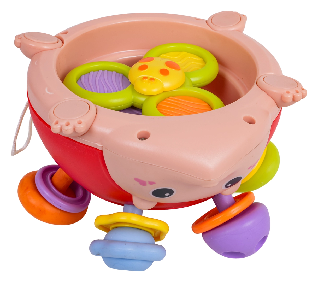 Под издатините се крият цветни рингчета, които дрънкат при разклащане. Децата могат да ги свалят, да ги поставят отново и да тренират координацията око–ръка.
