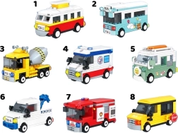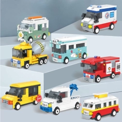 В асортимента са включени популярни градски и строителни машини: трамвай, автобус, училищен автобус, линейка, пожарна кола, трактор, бетоновоз и кемпер/ван. Всеки модел е самостоятелен сет с илюстрирани инструкции, подходящ и за начинаещи строители.