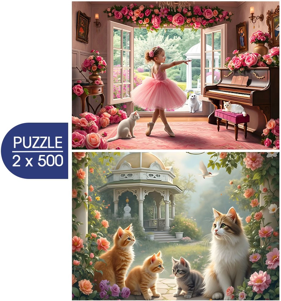 Насладете се на релакс с красив комплект от два пъзела на марката Alipson – мотиви Малка балерина и Романтична градина в опаковка 2×500 части. Качествена изработка, прецизни изрязвания и приятен формат около 47,8 × 34,2 cm след подреждане гарантират чудесно изживяване за деца и възрастни.
