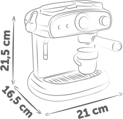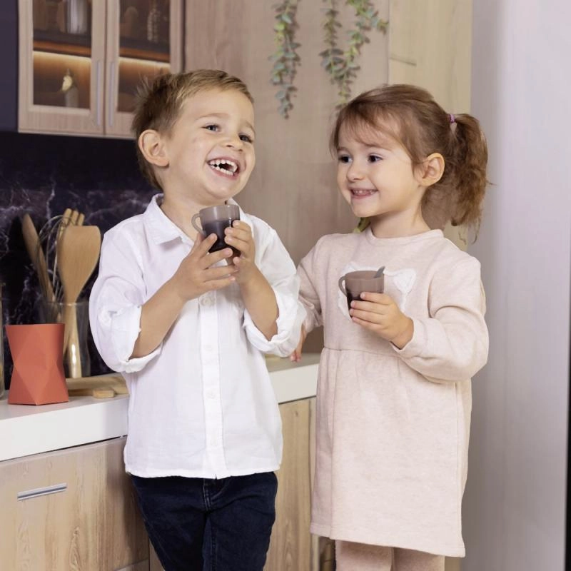 Практичният комплект включва 2 чаши, 2 лъжички и 2 капсули за кафе, така че децата могат да обслужват и приятели или братя и сестри. Компактните размери 16,5 × 21 × 21,5 cm гарантират, че кафемашината се побира на всеки детски кухненски плот.