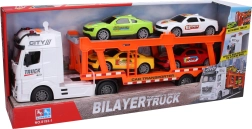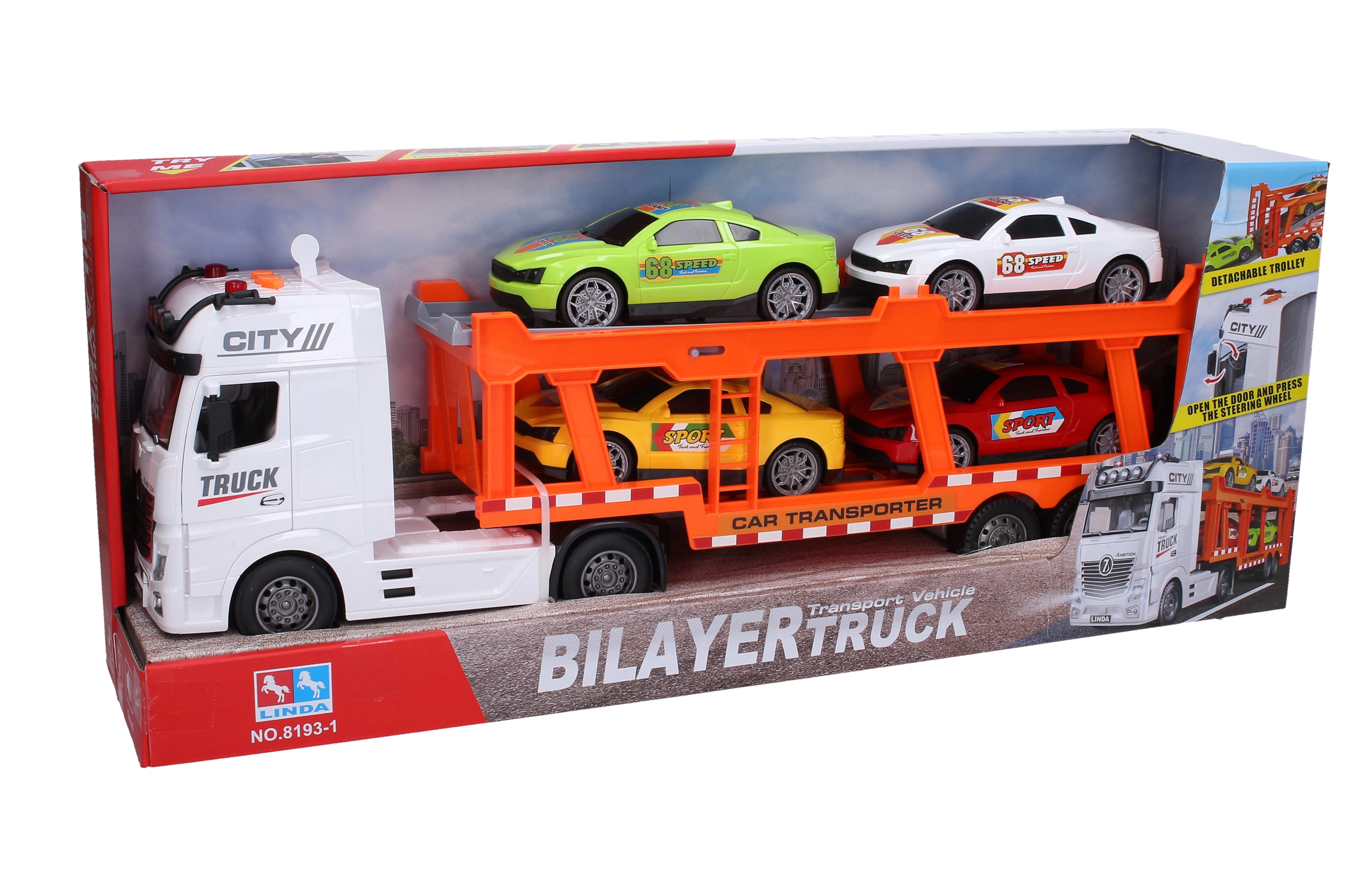 Голям авто тегач с инерционно задвижване с дължина 56 см доставя направо 4 стилни коли и гарантира много забавление благодарение на светлинните и звуковите ефекти. Активирането става удобно чрез бутоните на покрива, не липсват звук на двигателя, звук при движение назад и движение на платформата. Включени са батерии, така че забавата може да започне веднага.