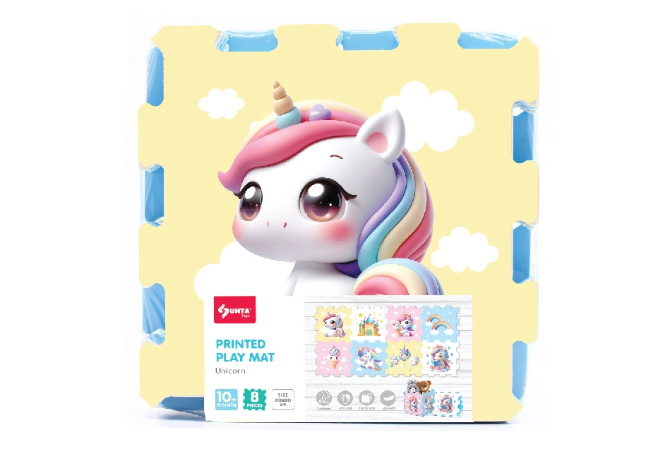 Оживете детската стая с игрив и безопасен комплект от меки пяни блокове с мотив еднорог. Комплект от 8 части с размер 30 × 30 × 1 cm е идеален за игра, подреждане и като подложка. Леки, меки и лесни за почистване елементи, които изолират от студ и омекотяват ударите.