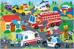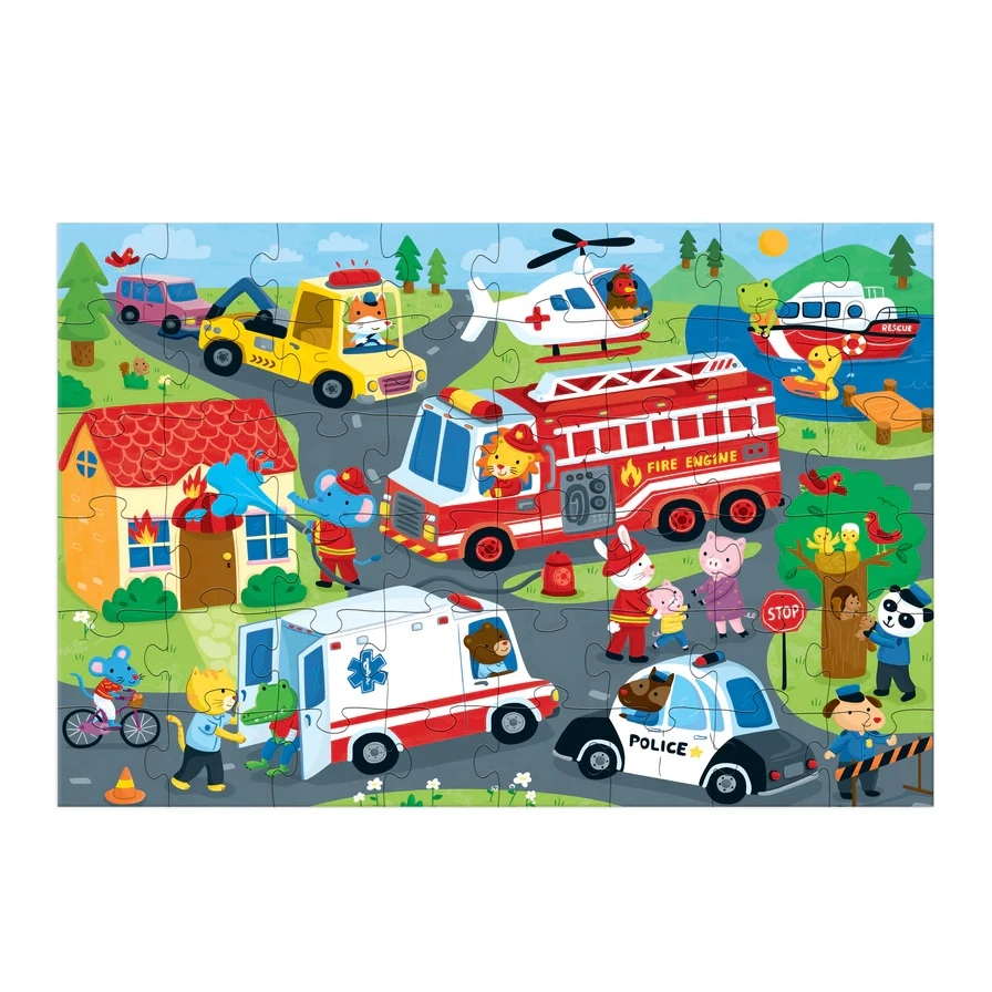 Големият подов пъзел MUDPUPPY Спасителни превозни средства ще зарадва всички малки почитатели на сирени и екшън. Благодарение на 48-те внимателно изрязани части децата лесно ще подредят сцена, пълна с пожарникари, полицаи и спасители. Големите елементи се държат отлично, не се пързалят и подпомагат развитието на фината моторика, концентрацията и въображението.