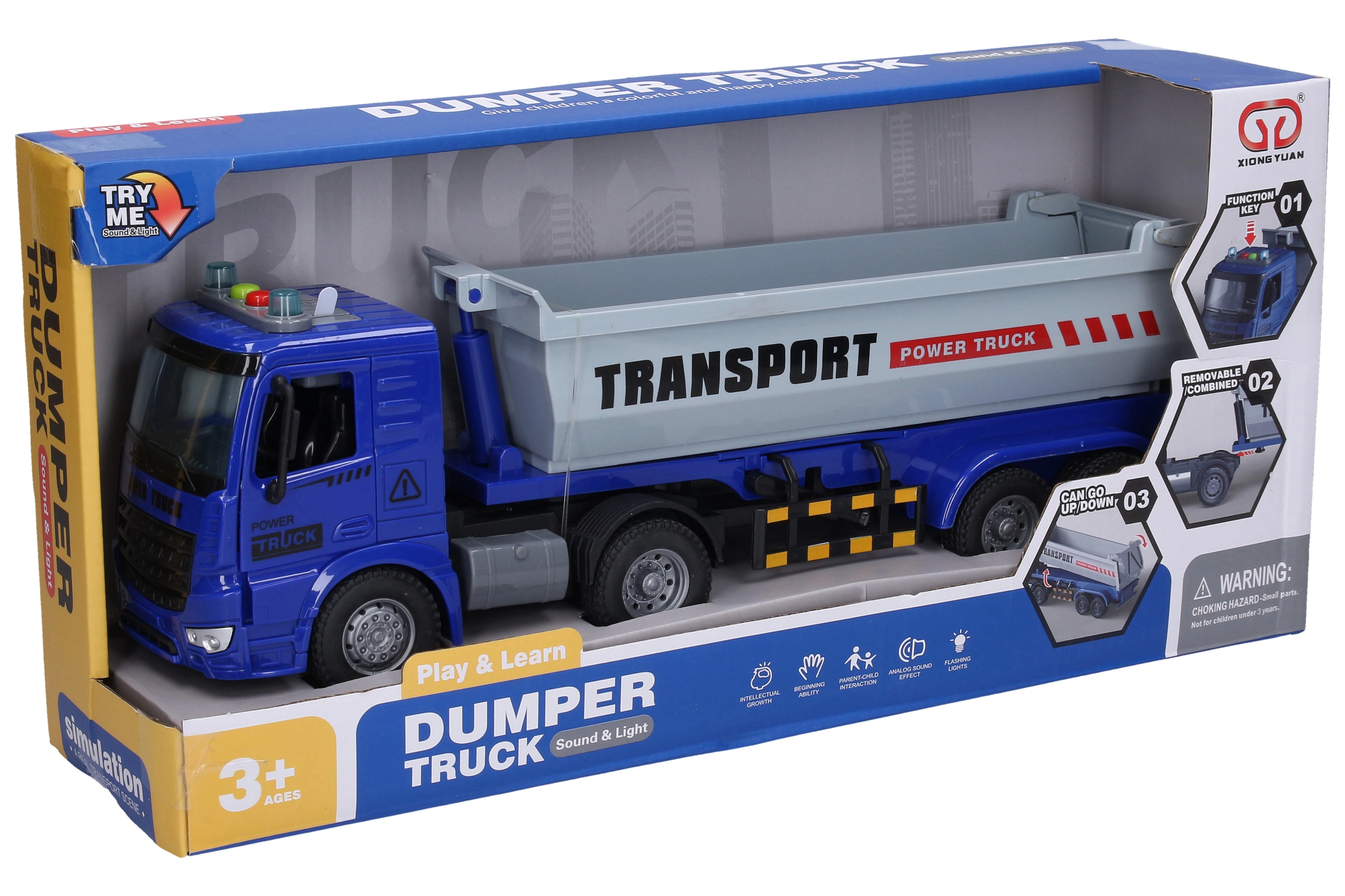 Реалистичният авто влекач със самосвална каросерия ще зарадва малките шофьори и колекционери. Предлага светлинни и звукови ефекти, инерционен механизъм за плавно движение и отваряеми врати. Благодарение на откачащото се ремарке и функционалната самосвална каросерия децата ще изживеят много забавление и ще развиват фантазията си по време на игра.