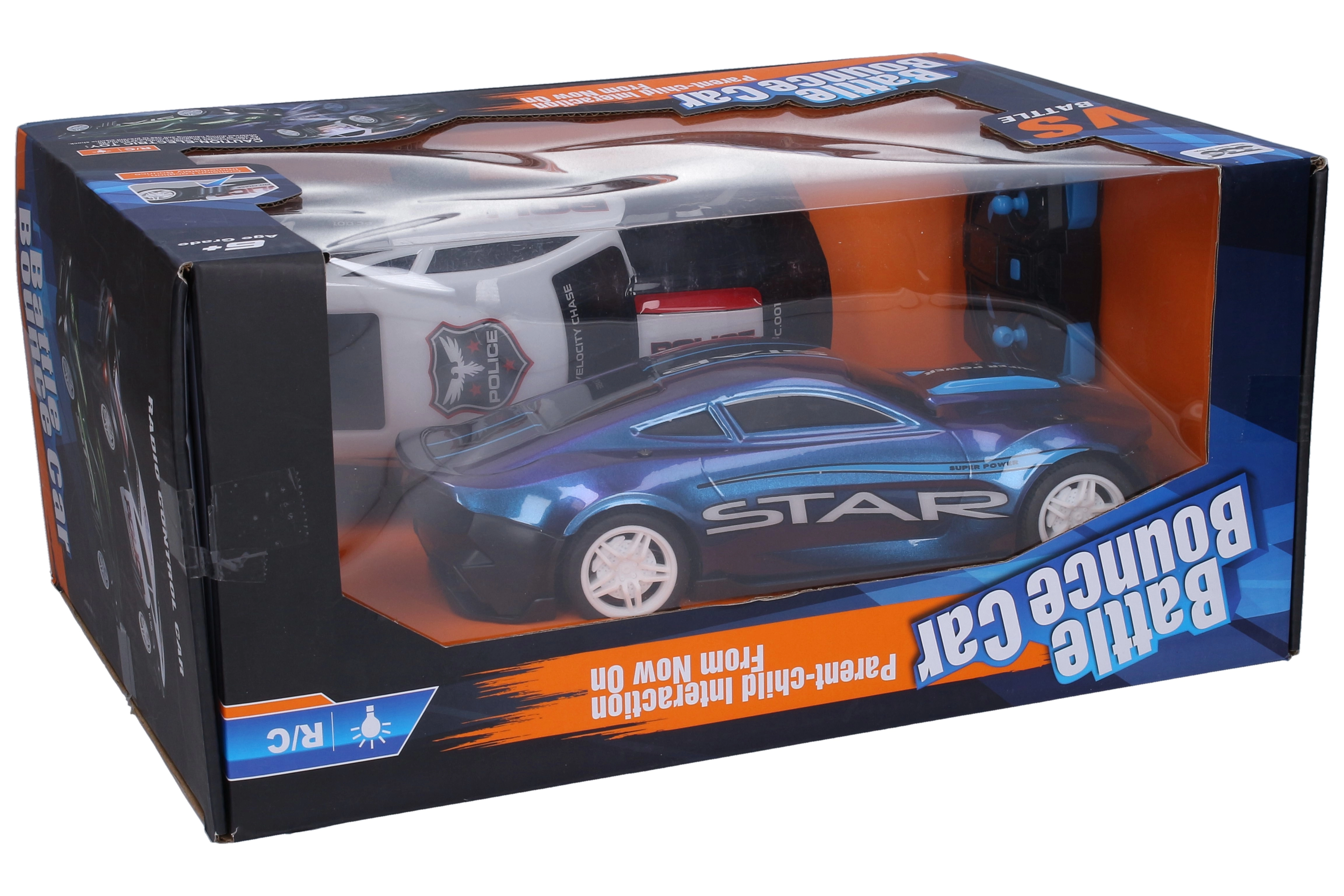 Насладете се на адреналиново забавление с двойка състезателни коли с дистанционно управление с дължина 25 см. Системата на честота 2.4 GHz позволява плавно управление без смущения, колите имат светлинни ефекти и специален механизъм за екшън дуели – удар в ауспуха от лявата страна на колата на противника причинява нейното дерайлиране.