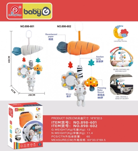 Сензорна висяща играчка за количка, креватче или столче за кола, подходяща от първите дни на живота. Изработена е от меки и безопасни материали, предлага шушкащи и пищящи елементи, ветрови камбанки и безопасно огледалце. Ярките цветове подпомагат концентрацията, хващането и развитието на сетивата на бебето.