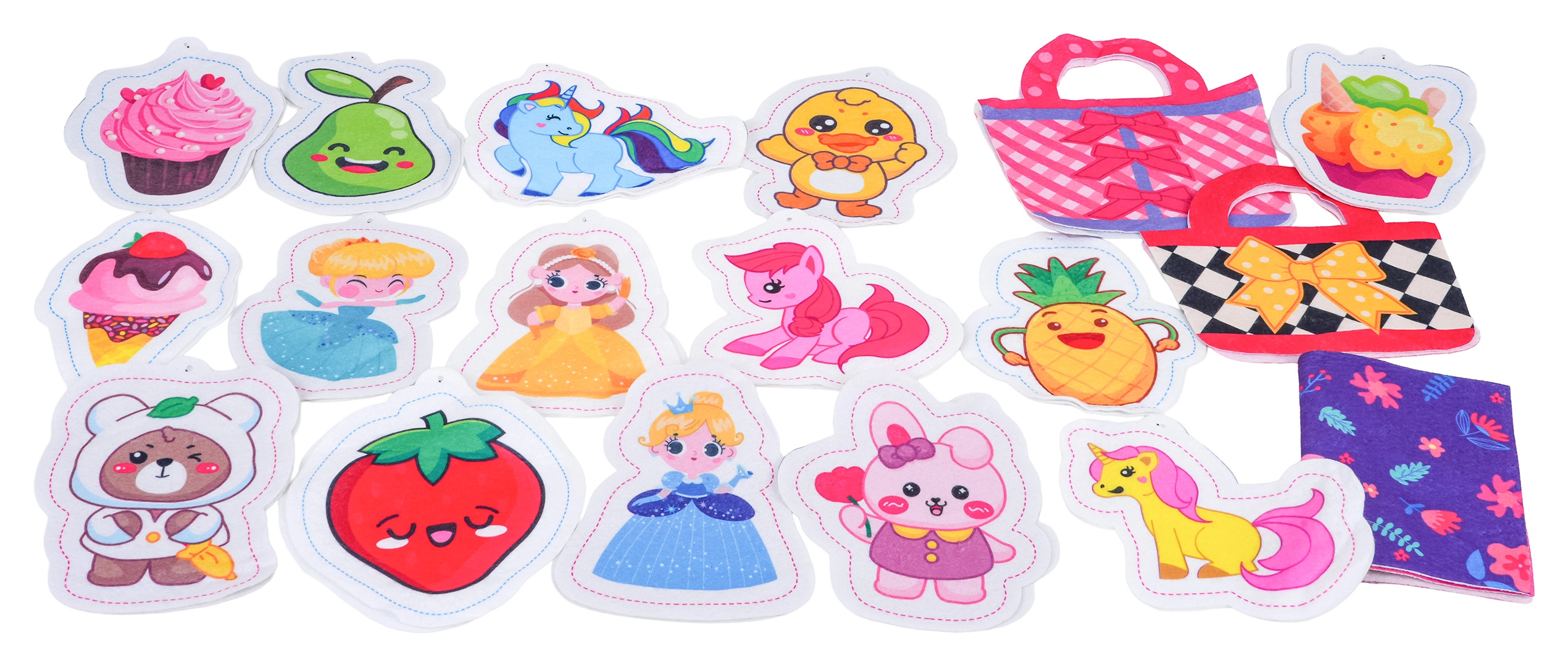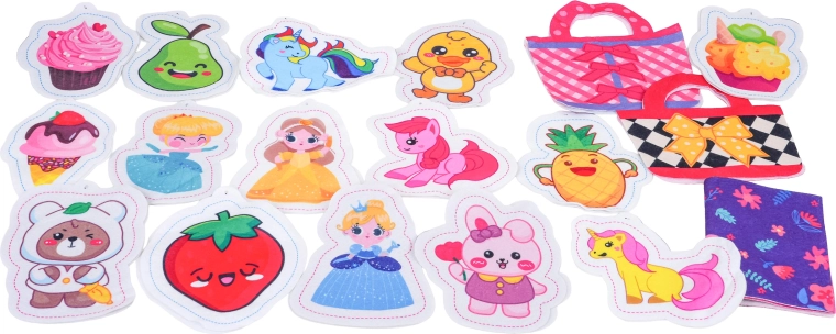 В комплекта са включени филцови шаблони за чантички, текстилни елементи, шаблони за изработка на плюшени украшения, пълнеж, верижки с мъниста и ножички – всичко, което децата имат нужда, за да създават свои аксесоари и сладки висулки. Играта развива координационни умения, търпение и творчество.