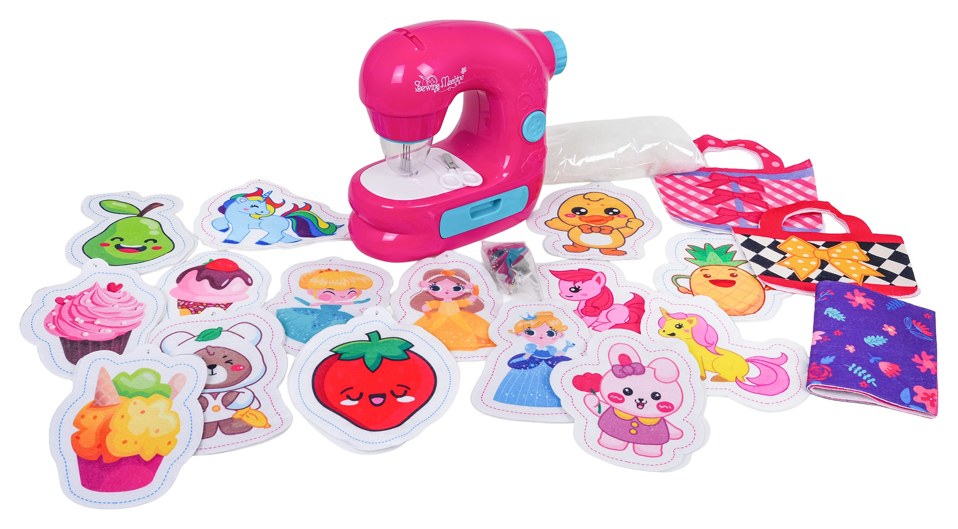 Филцови форми за чантички, платове, шаблони, пълнеж, ножички и верижки с мъниста – всичко необходимо за изработка на играчки и аксесоари.