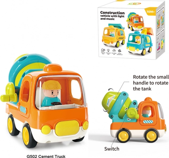 Този цветен детски бетоновоз е идеалното първо превозно средство за малки строители. Благодарение на фрикционното задвижване лесно потегля по пода, а светлинните и звуковите ефекти подпомагат сетивното възприятие и реалистичната игра. Здравата пластмаса без остри ръбове гарантира безопасност дори при интензивно ползване.