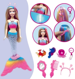 В комплекта е включен богат набор аксесоари – четка, гребен, огледалце и корони – които развиват фината моторика, креативността и сетивата. Куклата е чудесен избор за деца, които обичат приказки, цветове и вълшебна атмосфера.