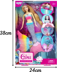 Куклата морска русалка WOOPIE Джина пренася децата в приказен свят, изпълнен със светлини, музика и фантазия. Дъговата подвижна опашка с розова перка, цветният топ и дългата руса коса приканват към ресане, плитки и стилизиране. Вградените светлинни и музикални ефекти подсилват игровото изживяване и превръщат стаята в подводно кралство.