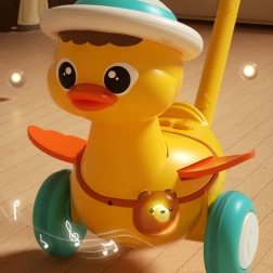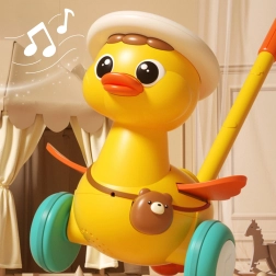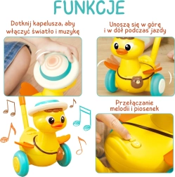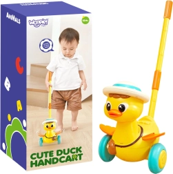 Очарователното патенце на пръчка от марката WOOPIE превръща първите стъпки в забавна игра. По време на движение маха с крилца, свети и пуска весели мелодии. Благодарение на леката изработка, стабилните широки колелца и лесното управление с бутони децата веднага ще го заобичат. Отличен спътник за развитие на моторните умения и самостоятелността още от 18 месеца.