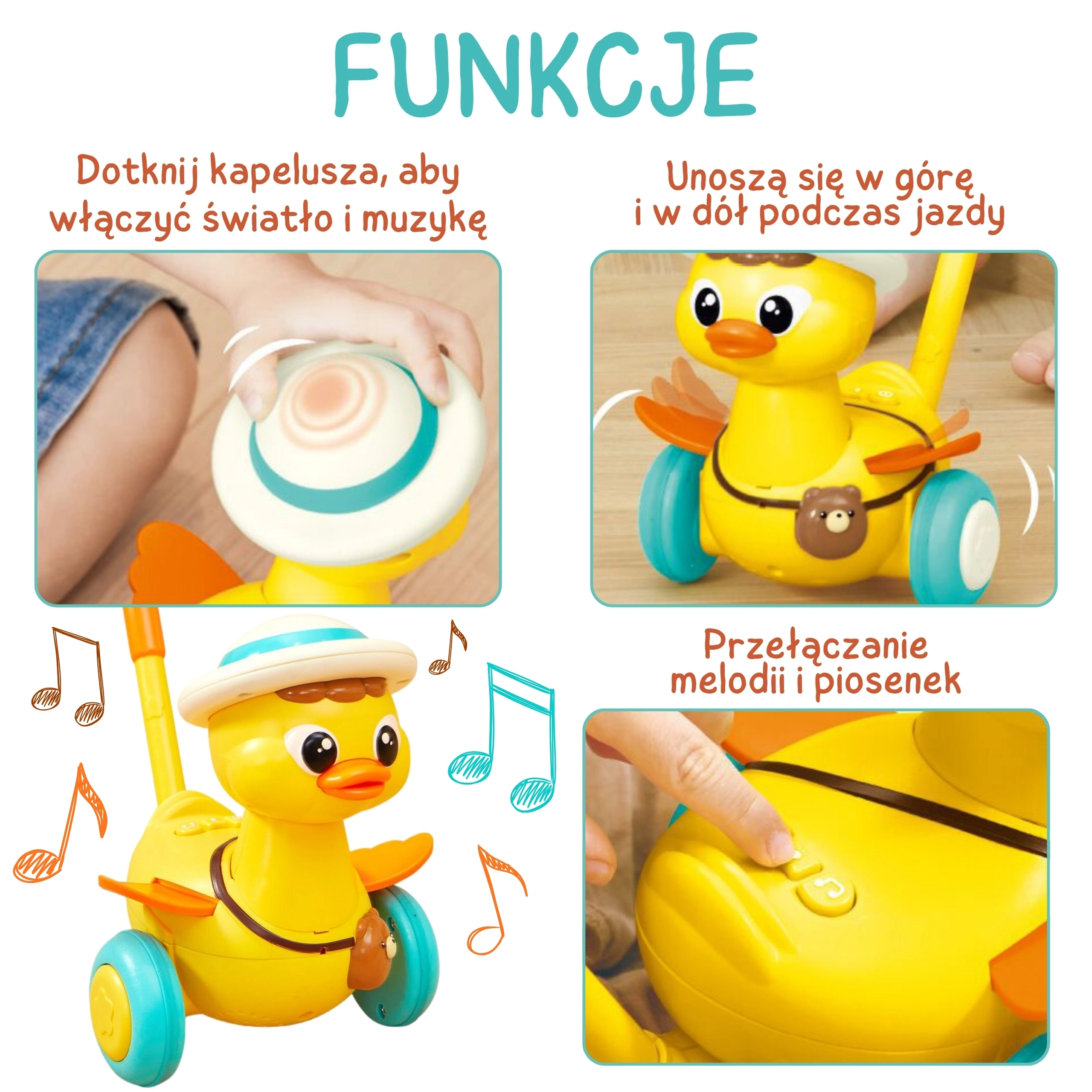 Детското патенце на водеща пръчка WOOPIE е идеална играчка за първите разходки у дома. При движение се поклаща сладко, маха с крилца и благодарение на светлинните и звуковите ефекти задържа вниманието на детето. Интуитивните бутони на тялото активират мелодии и светлинни ефекти, които мотивират към още стъпки.
