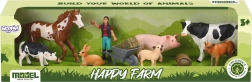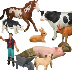 - кон (кестеняв с бял белег), крава (черно-бяла), теле/крава (черно-бяла), теле (рижавокафяво), прасе (светлорозово), овца/агне (светли), заек (рижавокафяв), фигурка на фермерка, количка, бали сено