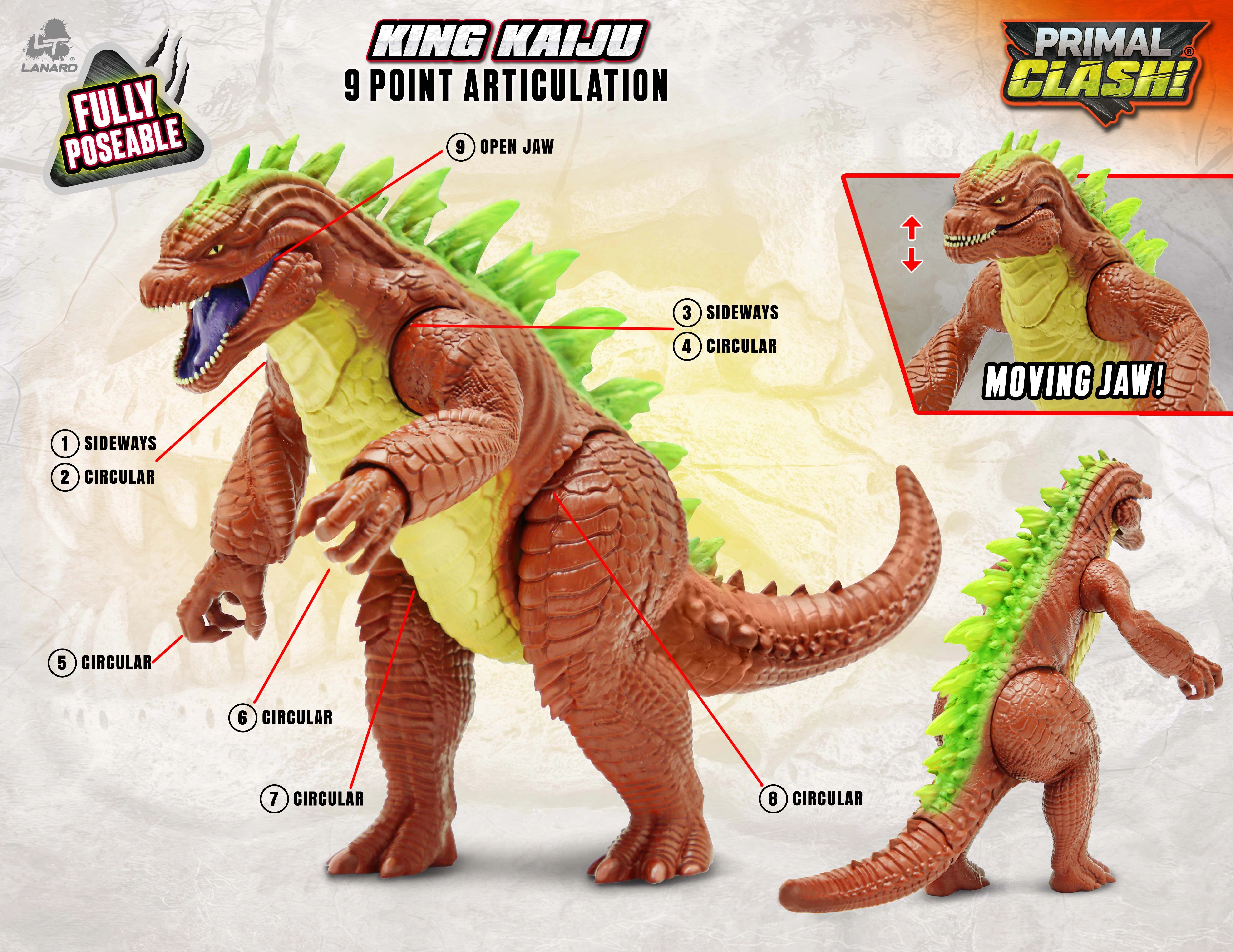 Влезте в света на чудовищата с внушителната фигурка King Kaiju от серията Primal Clash. Детайлно изработени люспи, контрастно оцветяване и изразени гръбни шипове придават автентичен, хищен вид. Благодарение на подвижните крайници, челюст и опашка фигурката лесно се позиционира за динамични бойни сцени и статично изложение.