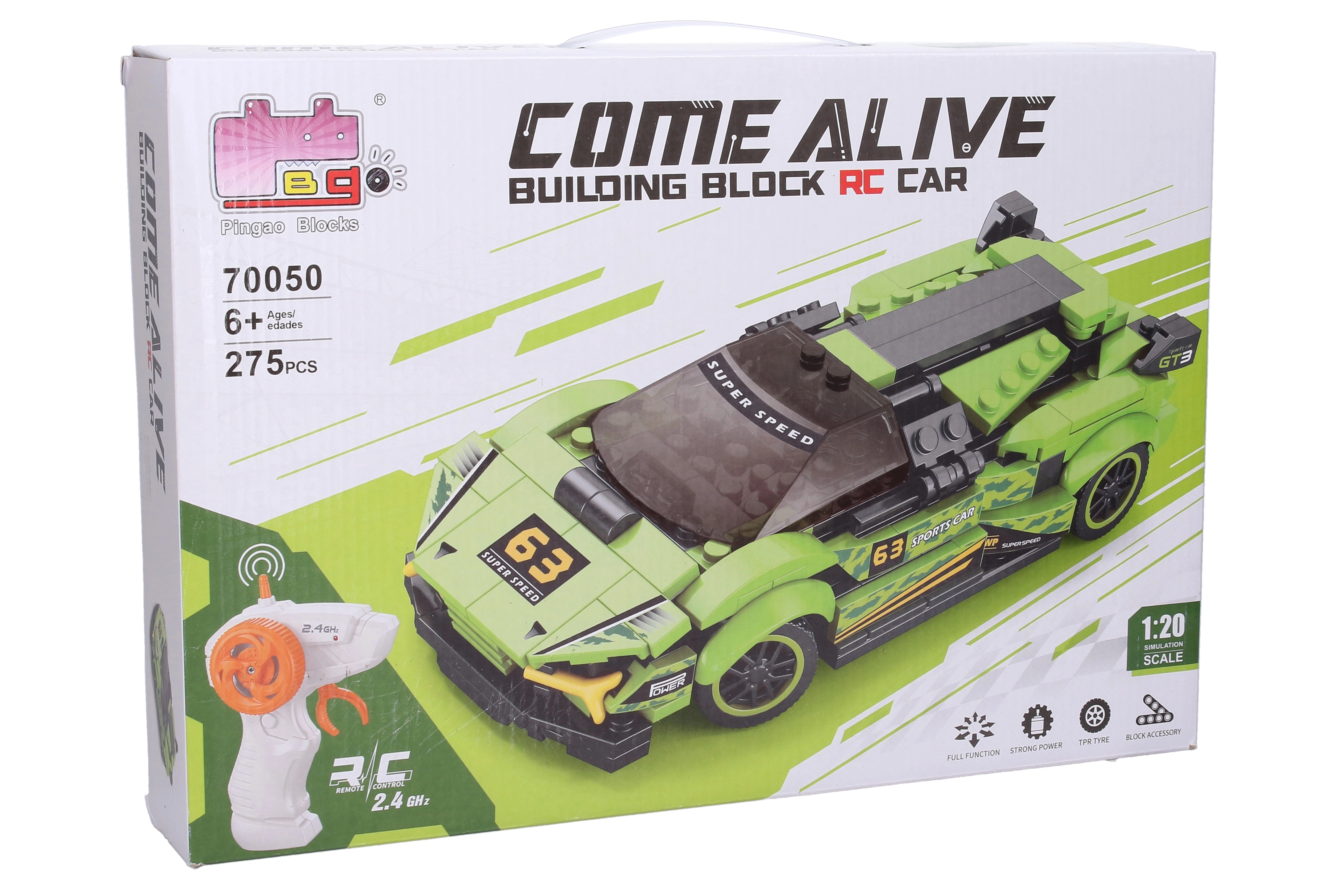 Сглобете собствена зелена RC кола и се насладете на шофиране на честота 2,4 GHz с пистолетен контролер. Комплектът включва 275 части, батериен пакет 3,7 V 350 mAh Li‑ion за колата и USB кабел за зареждане. Идеален като забавен проект и подарък за малки и големи строители.