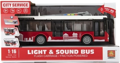 Открийте страхотния градски автобус от серията City Service, който впечатлява с реалистична изработка, червен дизайн и лесно управление. Благодарение на инерционния механизъм е достатъчно леко да го побутнете и той ще потегли напред, докато светлините и звуците добавят автентична атмосфера на градски транспорт.