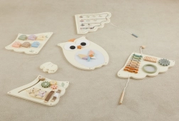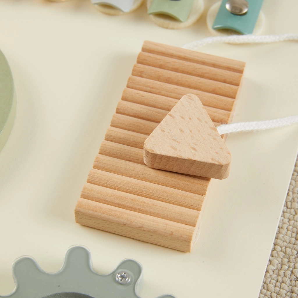 Ксилофон, зъбни колела, лабиринт, плъзгащи и отварящи се елементи, мъниста и вратички с изненада – всичко мотивира децата да изследват и развива фината моторика и логиката.