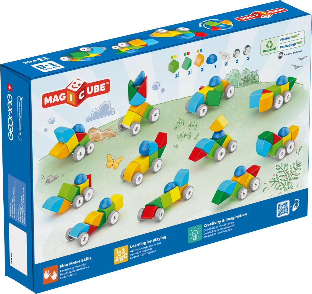 Открийте забавния магнитен конструктор Geomag Magicube с 13 части, който развива креативността, фината моторика и логическото мислене на децата още от 1 година. Комплектът от рециклирана пластмаса съдържа магнитни елементи и колела с шасита за строене на цветни колички и други творения.