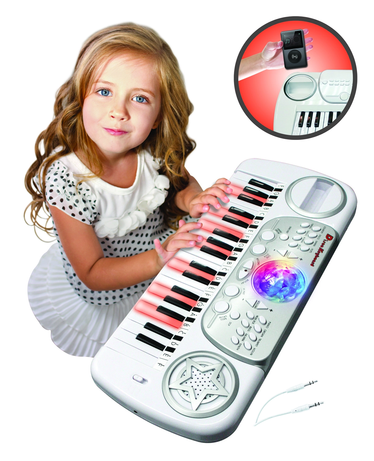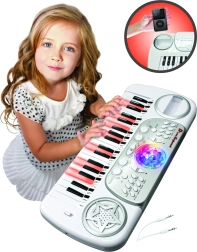 Забавни детски клавиши с интегрирана диско топка и микрофон, които внасят музика и светлинни ефекти във всяка стая. Предлагат учебна функция по светлинки, 37 клавиша, 22 демонстрационни мелодии, 8 инструмента и 8 ритъма. Налични са запис и възпроизвеждане, настройка на темпо и сила на звука и конектор за телефон/MP3. Идеални за малки начинаещи музиканти.