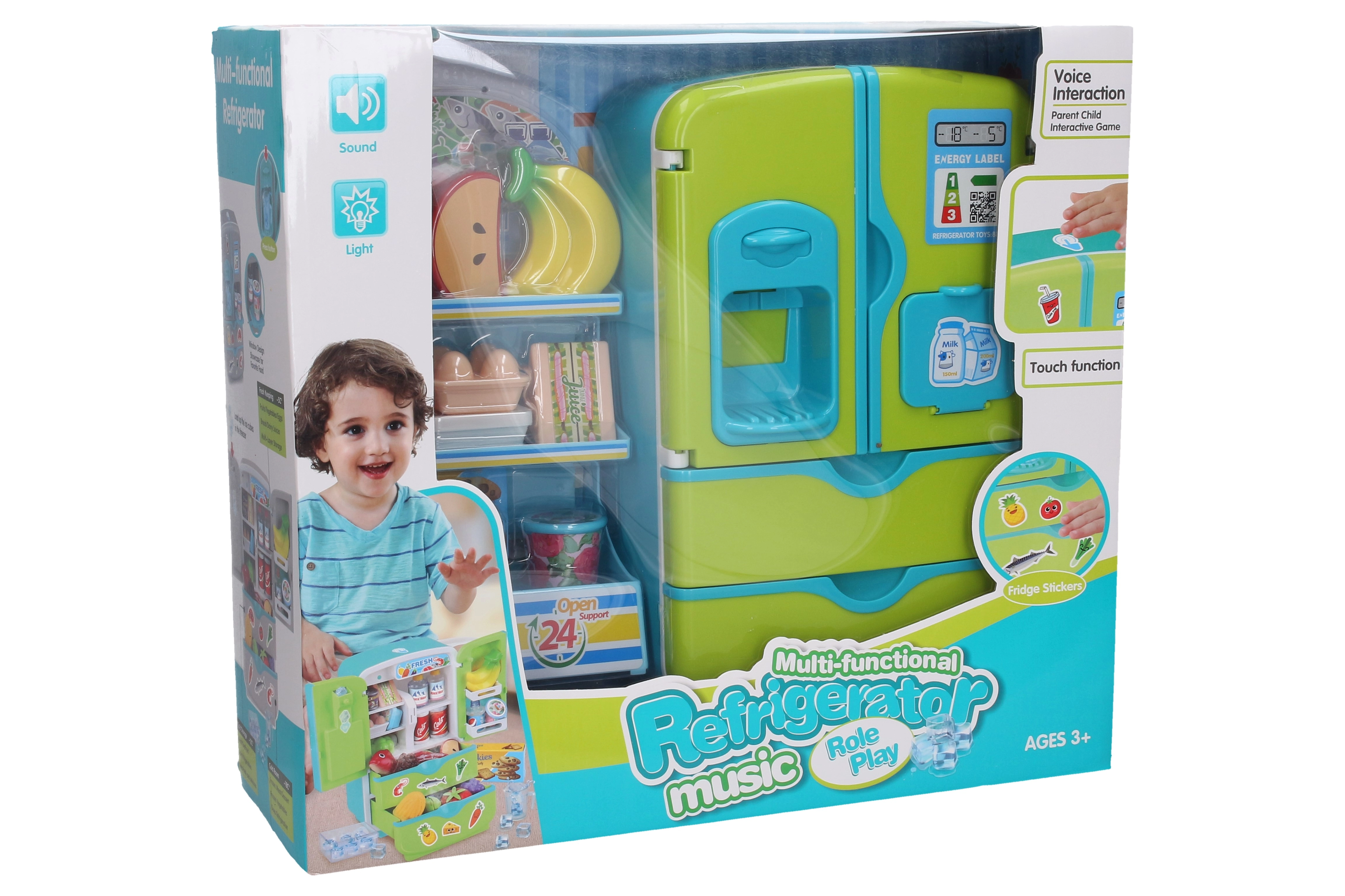 Забавен детски хладилник с рафт и храни с височина 28 см носи реалистична игра във всяка детска стая. Предлага светлинни и звукови ефекти, които стимулират въображението, и сензорно управление за лесно взаимодействие. Идеален за малки готвачи и търговци.