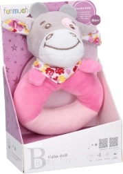 Очарователна плюшена дрънкалка във форма на пръстен с мотив кравичка ще зарадва бебетата със своята мекота и приятен звук. Идеална за първи открития, хващане и развитие на моториката. Мек плюш, лесно хващане и нежно дрънкане подпомагат сетивното възприемане.
