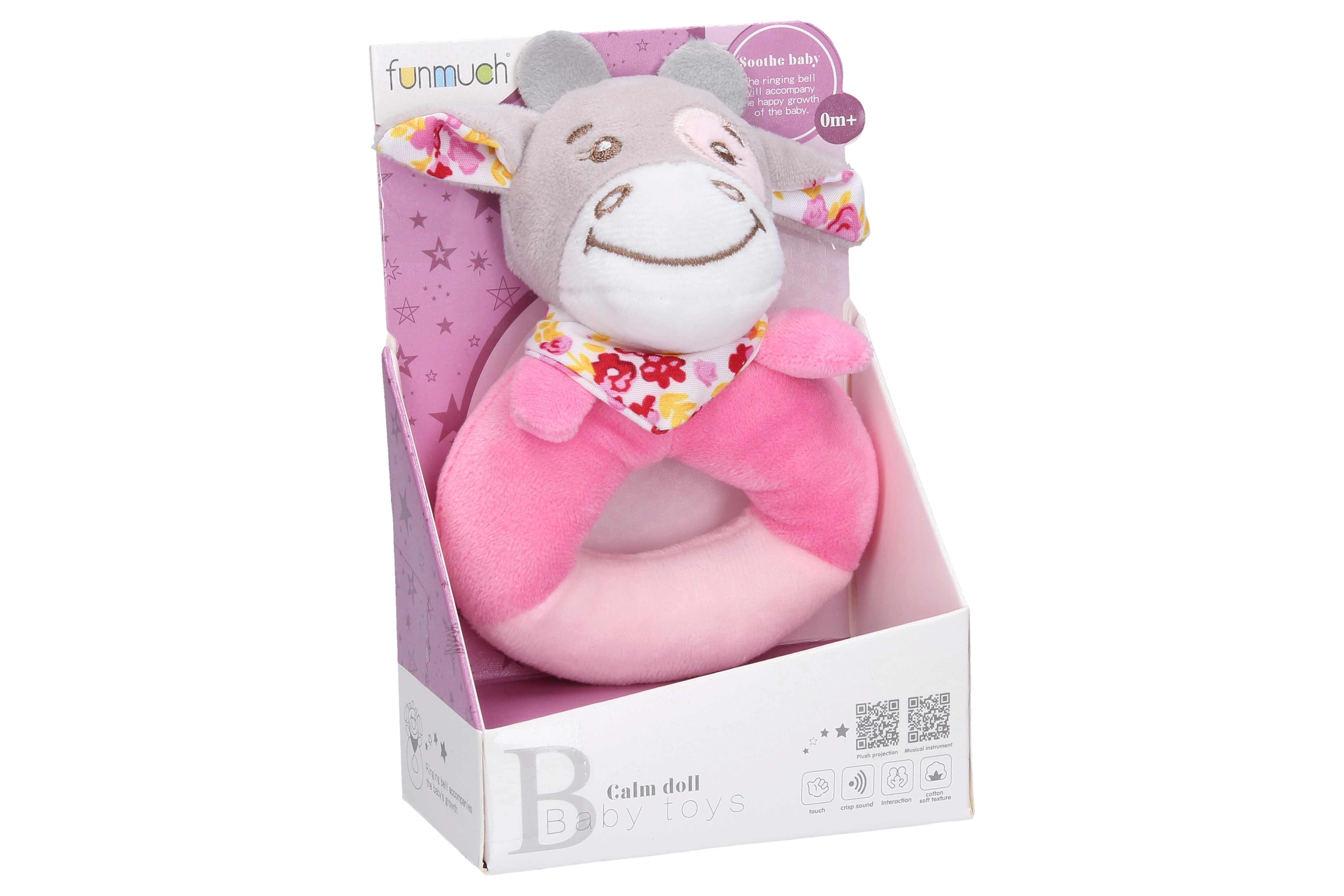 Тази плюшена дрънкалка във форма на пръстен е проектирана за малките бебешки ръчички. Сладката кравичка от нежен материал носи радост от допир и звук. Лекият дизайн улеснява държането, а нежното дрънкане подпомага възприемането на звука.