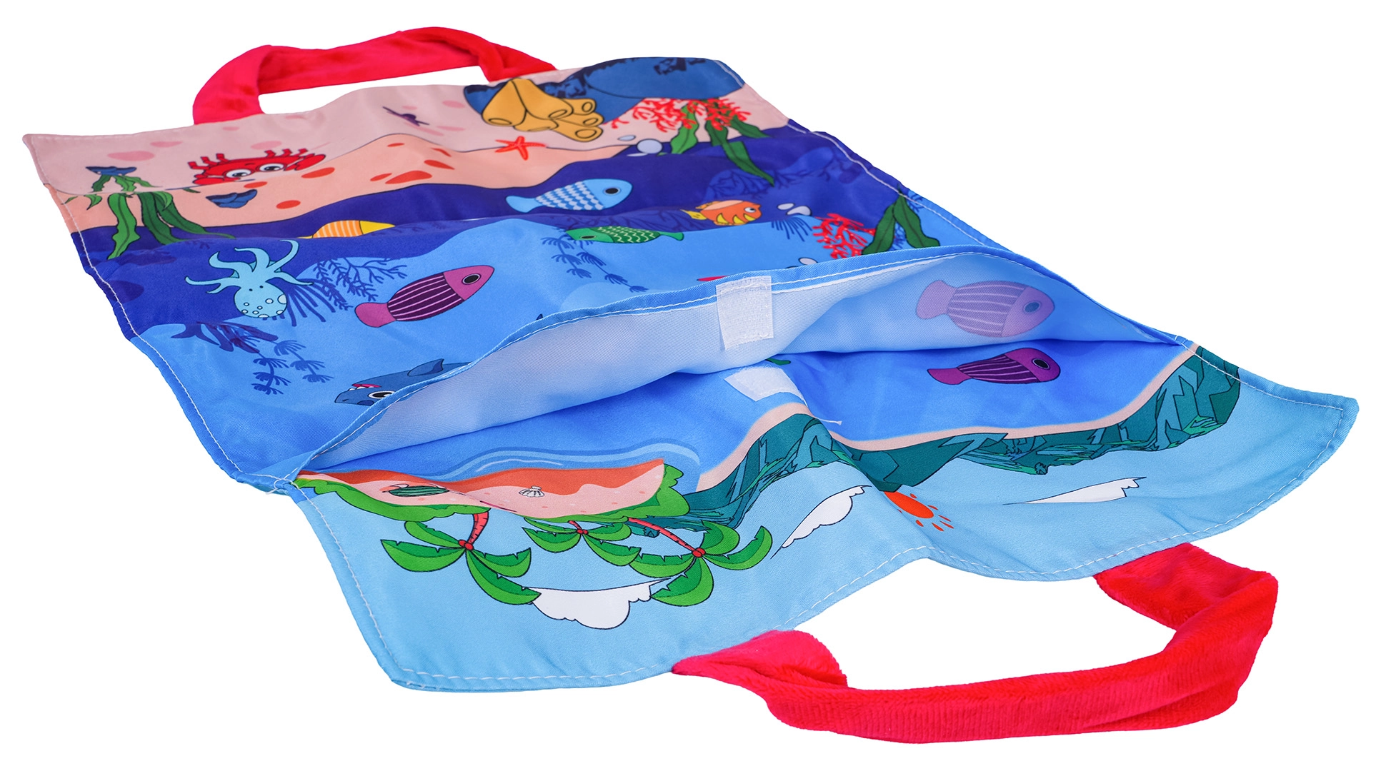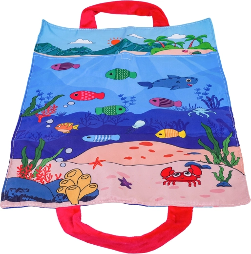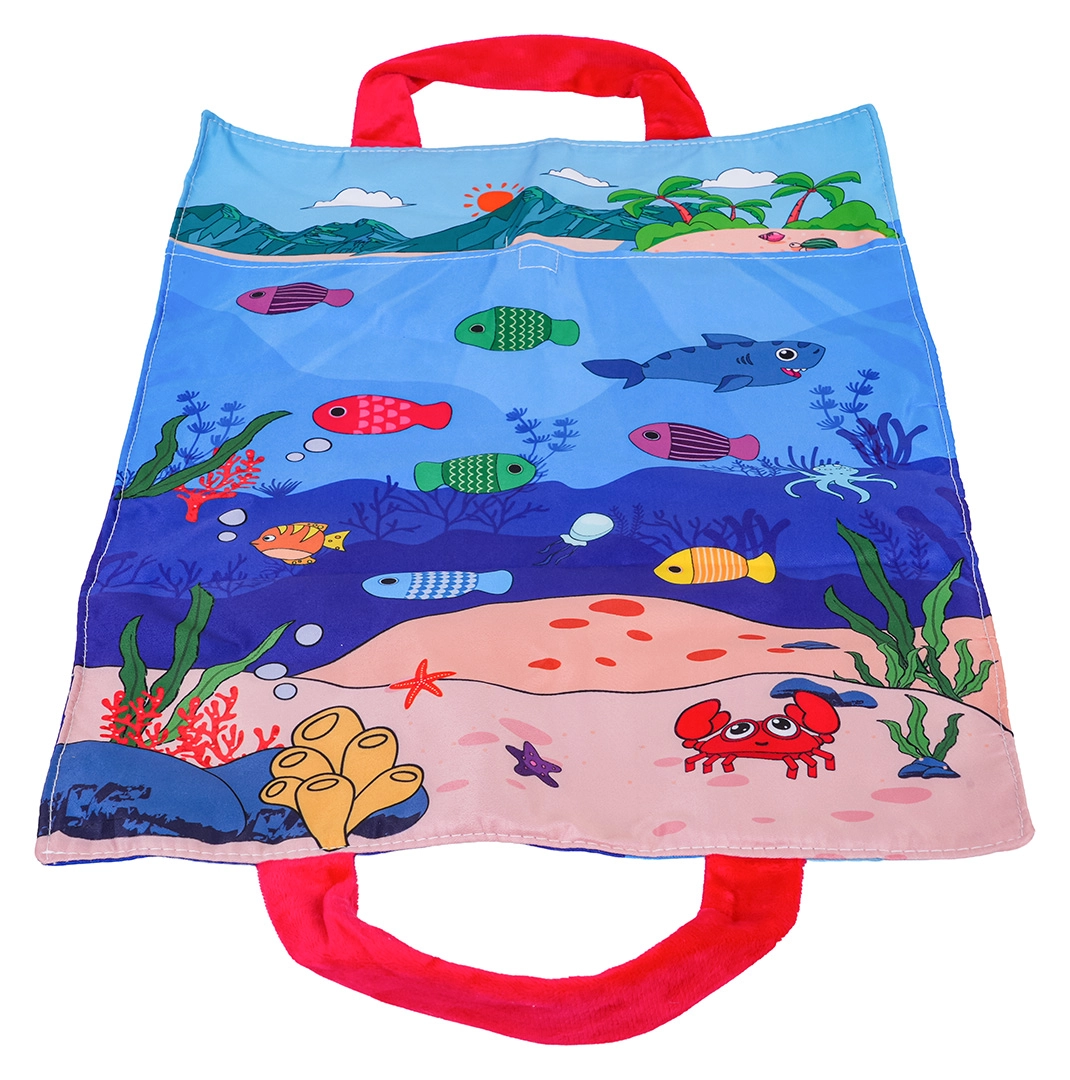 Постелката с морски мотив има вшити дръжки и може да се използва като преносима чанта. Всички части се прибират лесно и се вземат на разходка или на гости.