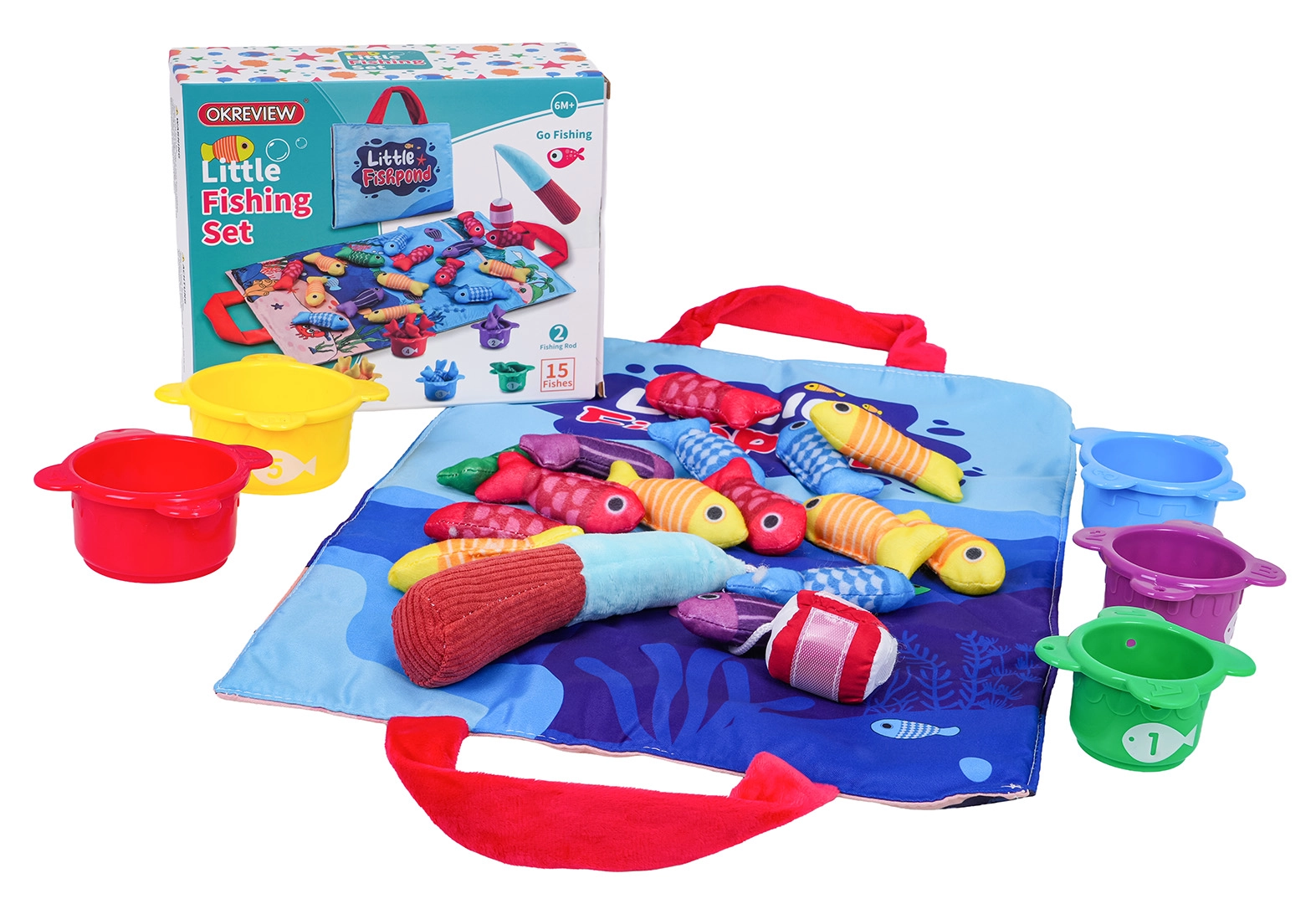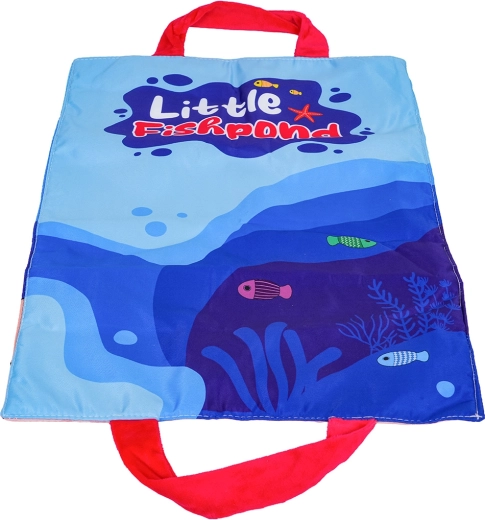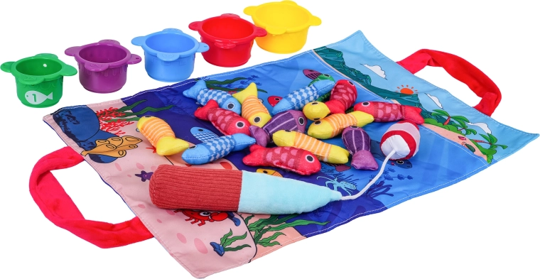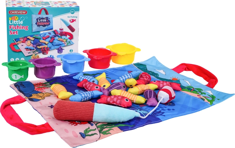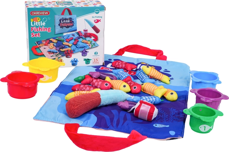 Открийте забавна активност за най-малките: мек рибарски комплект с текстилна постелка, 15 рибки, 5 чашки и мек въдичарски прът със самозалепваща лента. Подпомага развитието на фината моторика, координацията око–ръка, ученето на цветове и цифри, както и сортирането и броенето. Практичната постелка с дръжки за пренасяне служи и като чанта за съхранение на целия комплект.