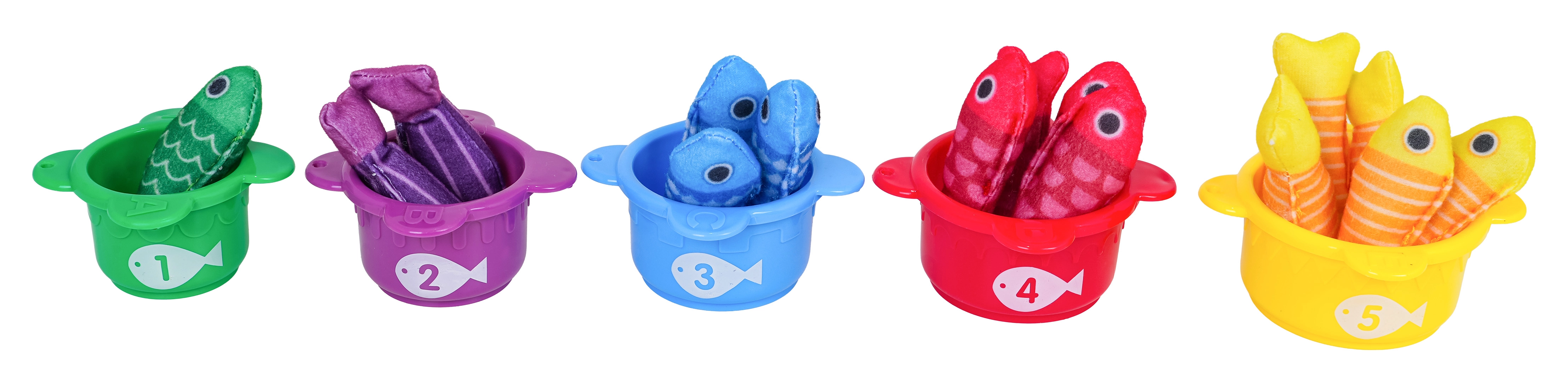 Петте чашки с числа 1–5 и съответните цветни рибки учат децата да сортират по цвят и на елементарно броене. Отлично за развитие на логиката и предучилищните умения.