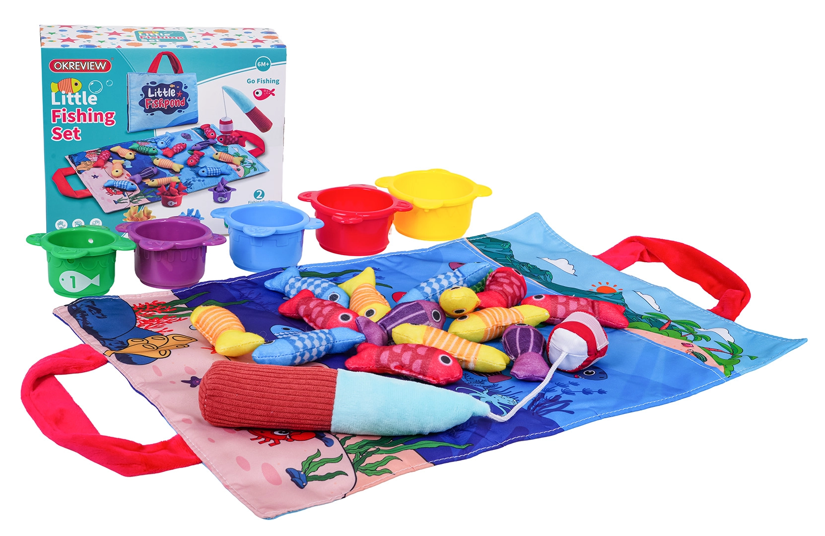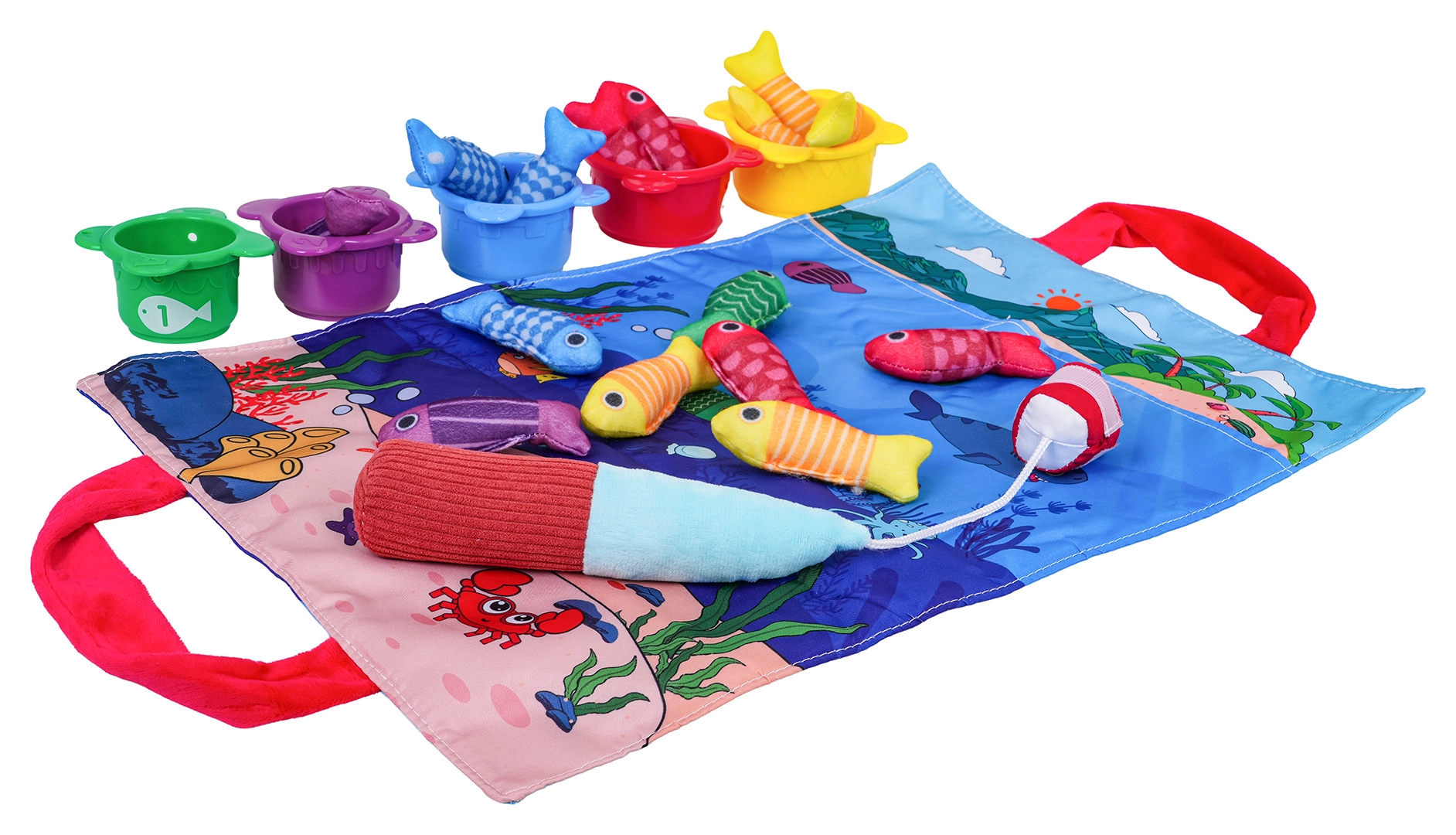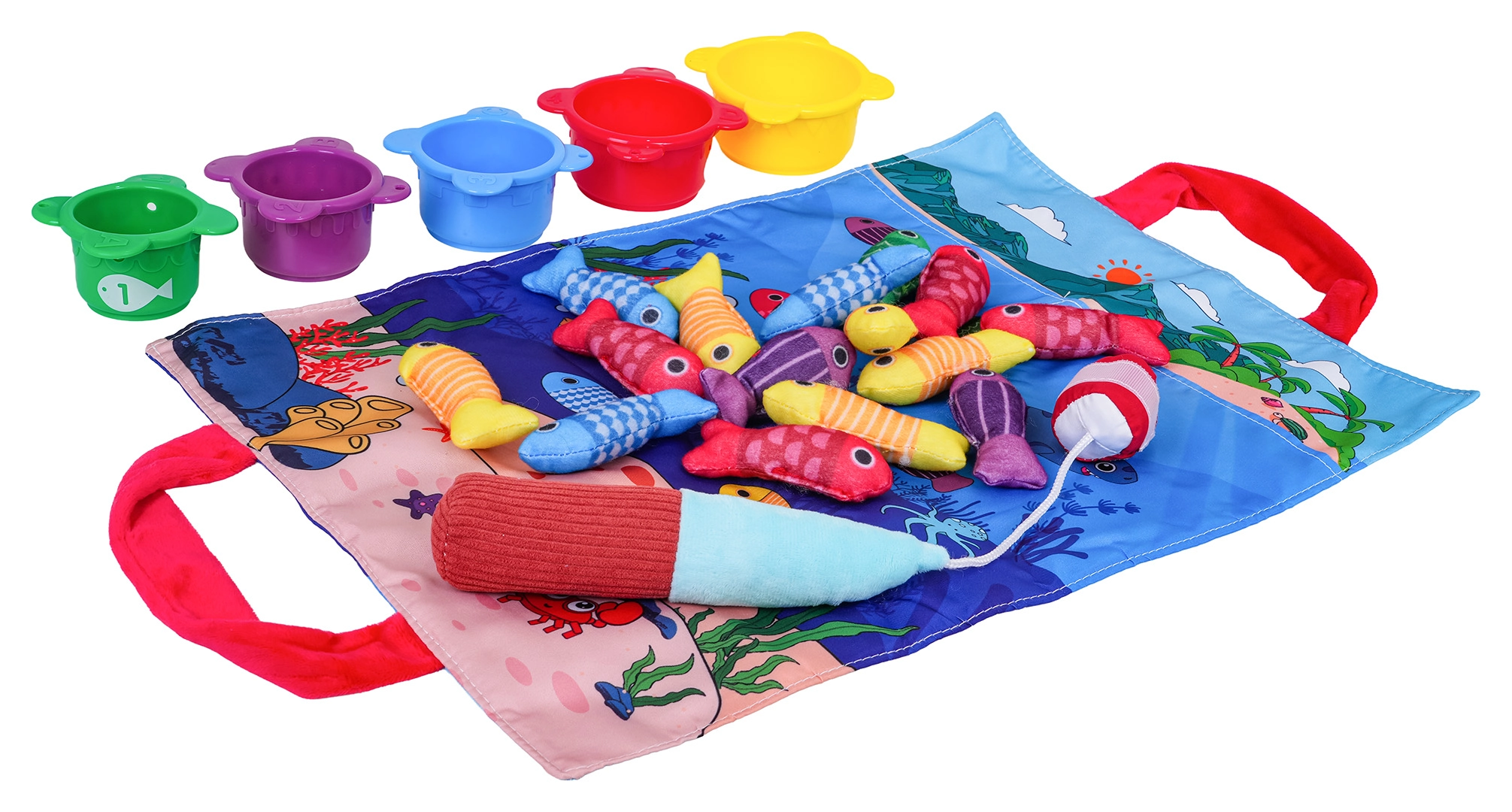 - текстилна постелка с дръжки, 15 меки рибки (5 жълти, 4 червени, 3 сини, 2 лилави, 1 зелена), 5 чашки (червена, жълта, синя, зелена, лилава), мек прът със самозалепваща лента