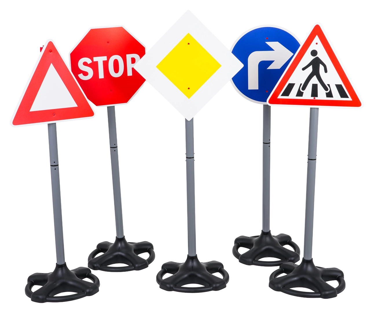 Този мега комплект включва пет реалистични пътни знака с височина около 75 cm. Децата чрез игра усвояват основните правила за безопасност и ориентация в движението. Здравата, лека пластмасова изработка със стабилни, утежнени основи гарантира безопасна употреба както на закрито, така и на открито.
