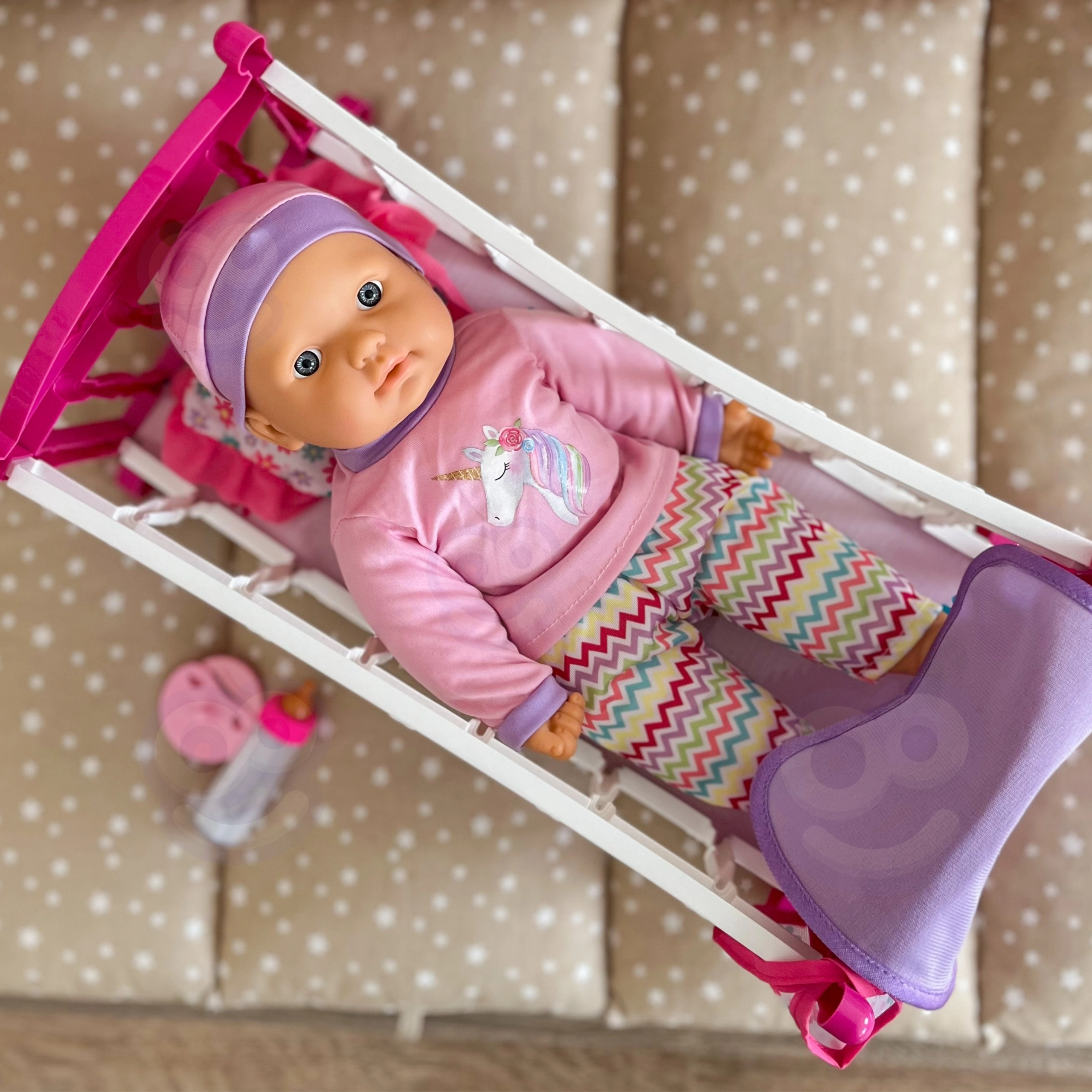 - Кукла, люлка, възглавничка, завивка, биберон, шише, лигавник