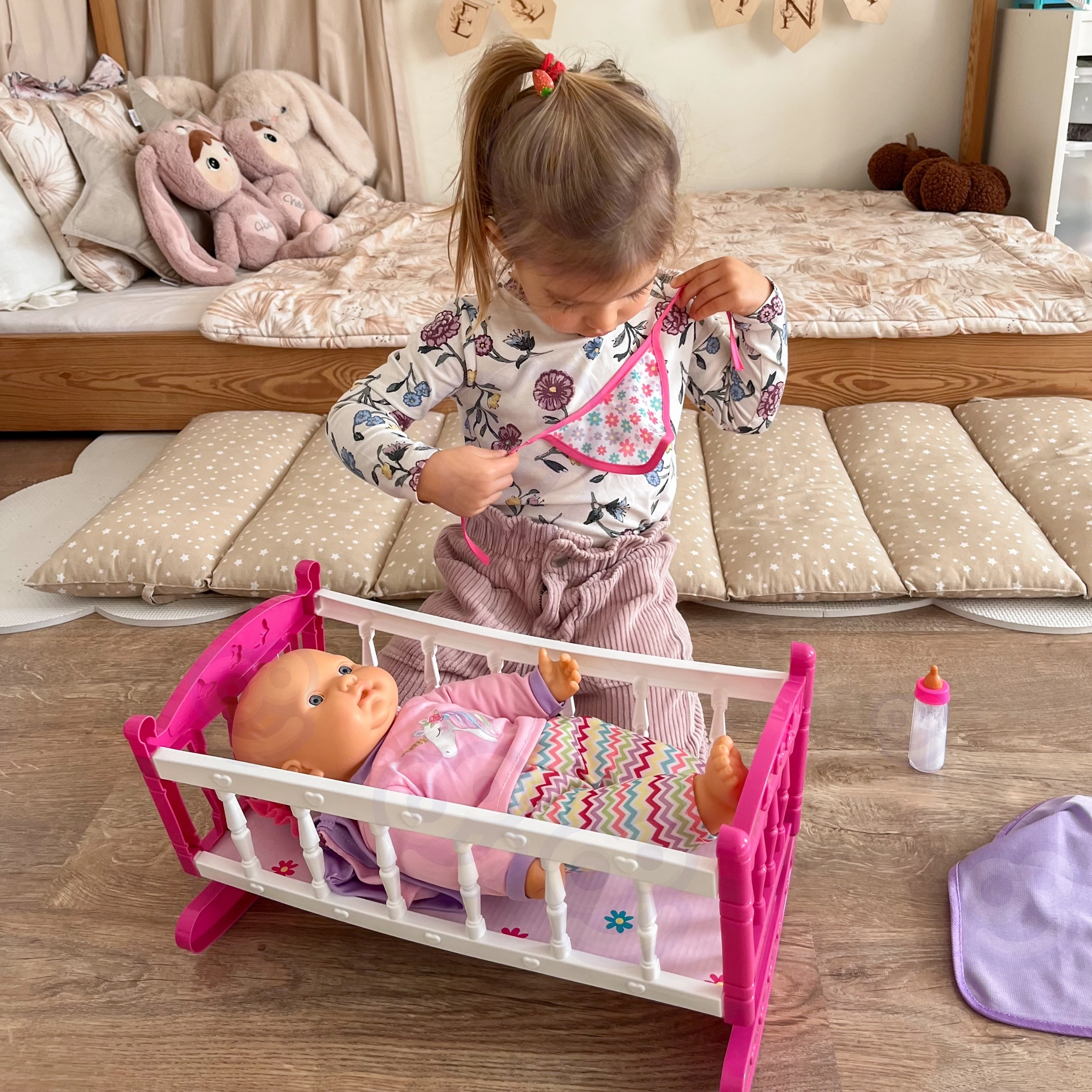 Розово-бялата люлка с ажурни страници и извити полози се люлее нежно и помага да „приспите“ куклата. Лека, стабилна и лесна за пренасяне.